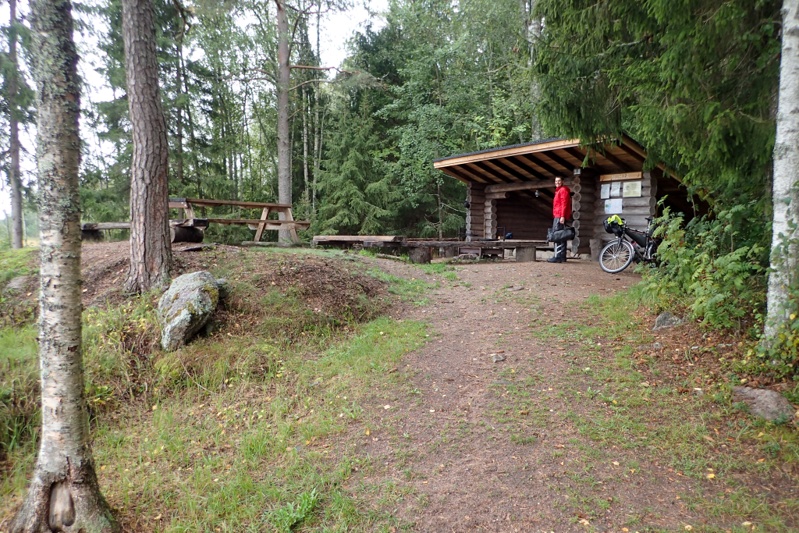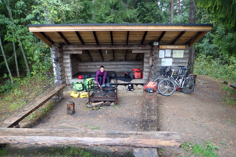 After the sunny warmth yesterday, we had a wet day today on the bikes. We slept well in the laavu and woke at first light (now 06:48!) as we wanted to limit our time in the wet. We had a quick 26km to Eura, our town of the day. We had a few km's riding on the E43 before Eura and then a good cycleway out of Eura. We made it to the shelter of the K-Market before the rain arrived which was a relief! We did some shopping for food and then sat inside at a little table and had our coffee and bickies. As we sat looking through the window at the heavy rain our thoughts turned to wonder, "Can we make it to Turku today?". The thought of hunkering down in a laavu for the afternoon while the rain poured down made an extra night with the nuns seem attractive. We worked out that it would mean a 116km day to get all the way to Turku. We decided to make our final decision at the turn off to our laavu in about 26km. We put on our wet weather gear after our break and the showers came through on and off. It was pretty wet. We rejoined an actual cycle route which we have not been on for a long time. This took us onto a gravel road for a stretch. When we turned off the gravel road we stopped in a bus shelter to have something to eat. We had 3km to our planned laavu, so had to make a decision. Looking at the weather radar online, we could see that there would be some very heavy rain this afternoon and that the weather actually looked better tomorrow, with the rain clearing by 09:00. We decided to stick with our original plan for the day of 55km, staying in the laavu and then the last 67 km into Turku tomorrow. The laavu is in a nature reserve and very well-built, like last night's one, but smaller. Finnish laavu's are always 100% watertight as they use waterproof material on the roof, unlike our experience of Swedish laavu's which leaked like sieves in the rain! We set ourselves up in the laavu after our last cold swim of the tour! It is quite snug in here sitting in our sleeping bags watching the heavy rain fall. It feels like the right end to the tour.