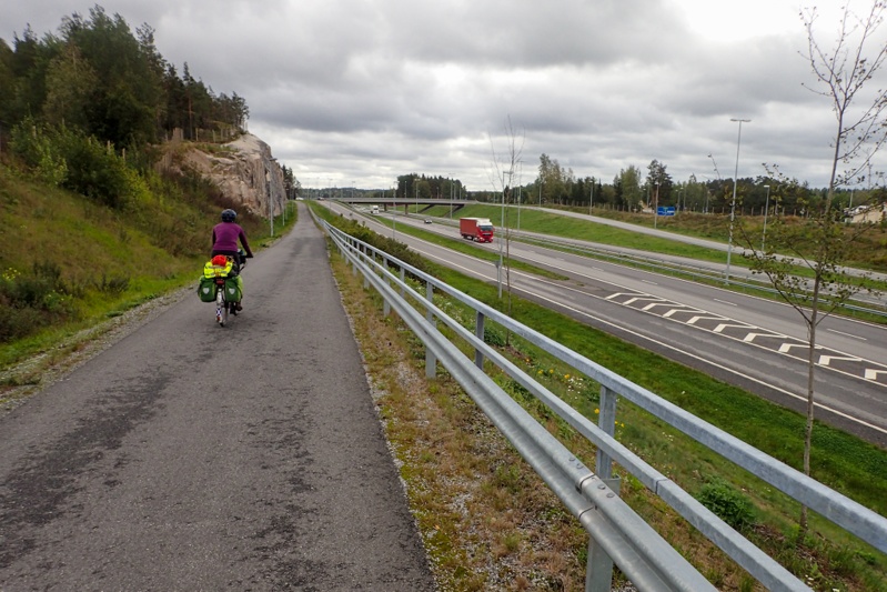 We threw away some things on the way in bins/recycling places wherever appropriate. One thing that would interest the "greenies" reading is that in Finland every teeny village or farming community has a clump of large recycling bins in a central area, but you have to stop to check what you can recycle, it is different in each state or region. Here we found we could deposit our dented alluminium fuel bottle, but not our plastic tent undersheet. With 20km to go we hit a major dedicated cycleway to Turku and we also hit the headwind proper so it was hardwork getting into town. The cycleway runs parallel to the freeway and was good. In a fitting end to the tour we said "hi" to a road skier coming towards us.