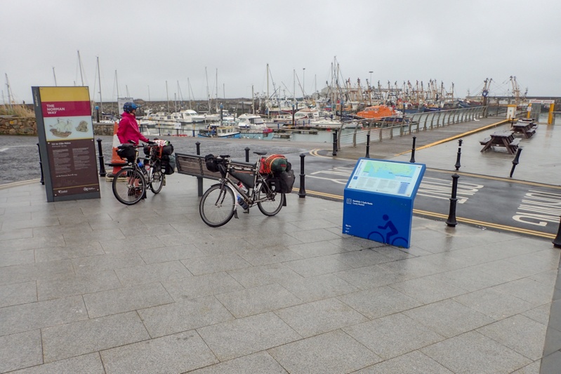 We struggled to sleep last night as the wind was very noisy. We had a sheltered site, due in part to a row of trees which held up well in what turned out to be 85km/hour wind gusts. This storm has travelled from the West Coast of Ireland where it clocked wind gusts of 150km/hour. They called it Hannah. If a storm has a name, you know it is bad. Hopefully it will have truly blown out by the time we get there. We had a relaxing start to the day and headed in to town around 10:00 to shop for food and then down to the ferry terminal. It was still breezy, but no rain which was good. The ferry trip with Stena line was a bit bumpy and we arrived in Rosslare, Ireland just before 17:00. As we disembarked it immediately felt warmer than Wales and the sun was out! We shopped again en route to our campsite; piping hot shepherds pie for dinner from the local supermarket. Rosslare is pretty and flat and we had a short ride to our campsite. The cycle route is immediately sign posted from the ferry. It is Euro Velo Route 1, or cycle route 3 - The Norman Way.