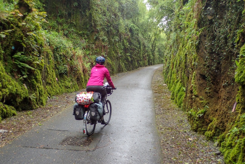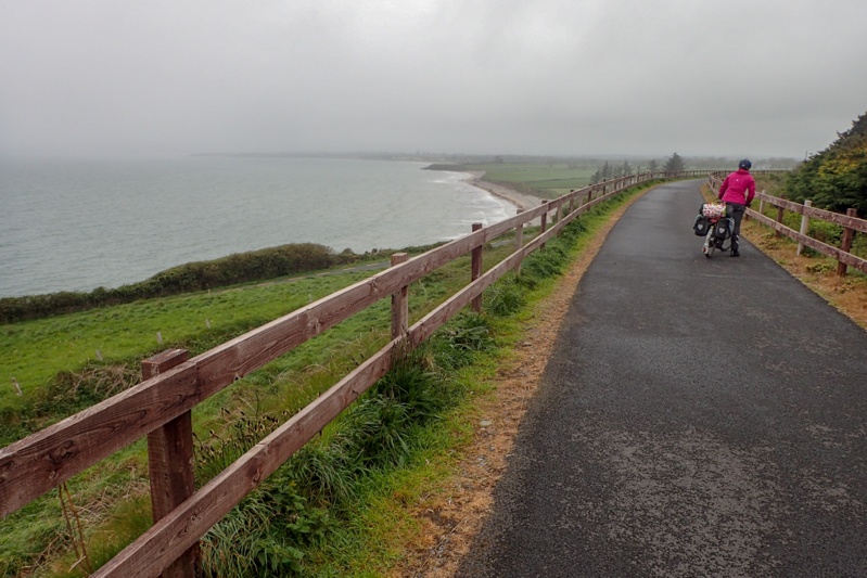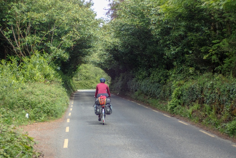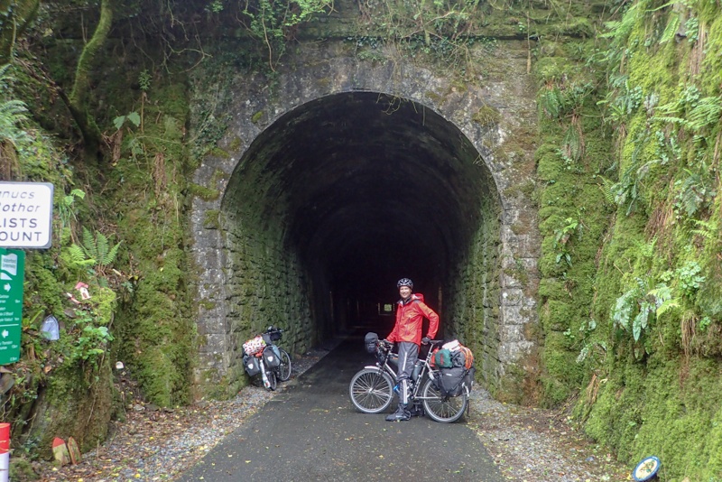 We left Waterford on the Waterford Greenway. This is an exceptional piece of cycling infrastructure and can only be described as the King of Railtrails. We have used many such trails on cycle tours but this one reigns supreme. 50km long, stretching from Waterford to Dungarvan, it is fully bitumen-sealed and makes use of old rail tunnels or new culverts to cross roads. Other minor road crossings have easily navigable gateways. The beauty of a railtrail is that it will lift you 100 m or more at such a gentle gradient you almost don't know it is happening. This trail was a pleasure from start to finish. As we rode we looked out over green fields of cows. There is a functioning train line for the first part of the route, complete with a little train that we passed on the way. The old rail tunnels were beautiful, a highlight being one fairly long tunnel which took us through the hill just before Dungarvan, which had the original little alcoves in the walls, but now fitted with electric lights. Just before and after this tunnel you rode through a forest of green ferns and moss, and these walls were filled with little fairy doors made by children/families. So cute!