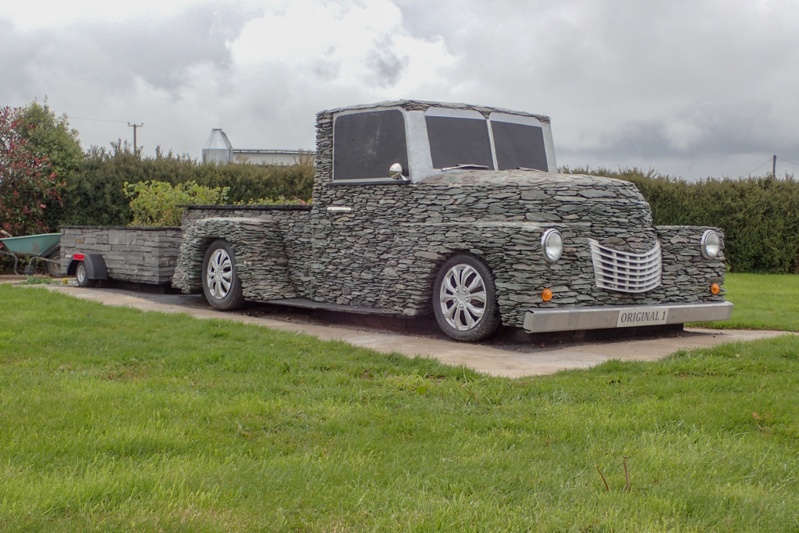 The weather began to improve and as our route climbed up on quieter farm roads we took off all our wet weather gear and did not have to put it back on for the rest of the day! We enjoy Irish farmland, the farm houses are beautifully kept and interesting and the stone walls are intricately made. We passed a stone mason's studio and there were amazing examples of his work in the garden, including the car made of stone which you can see in the picture below. Amazing!