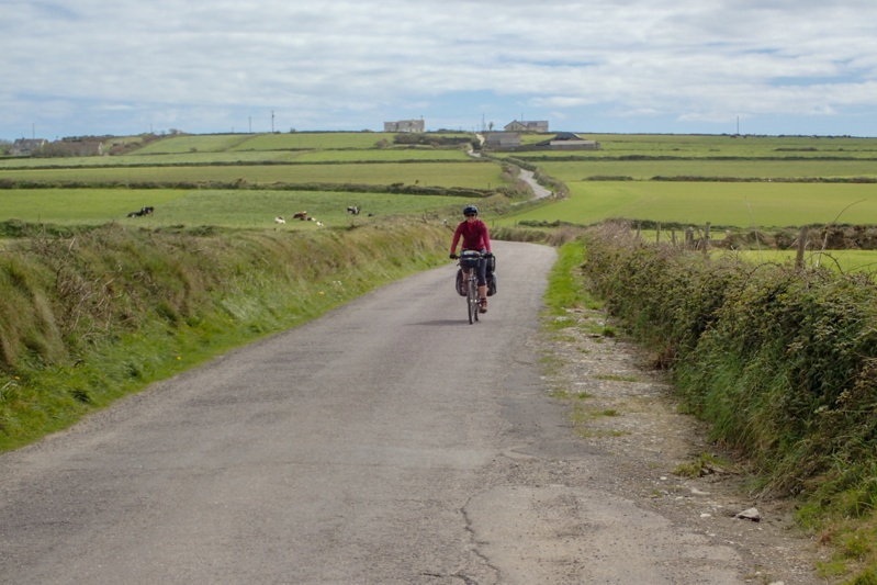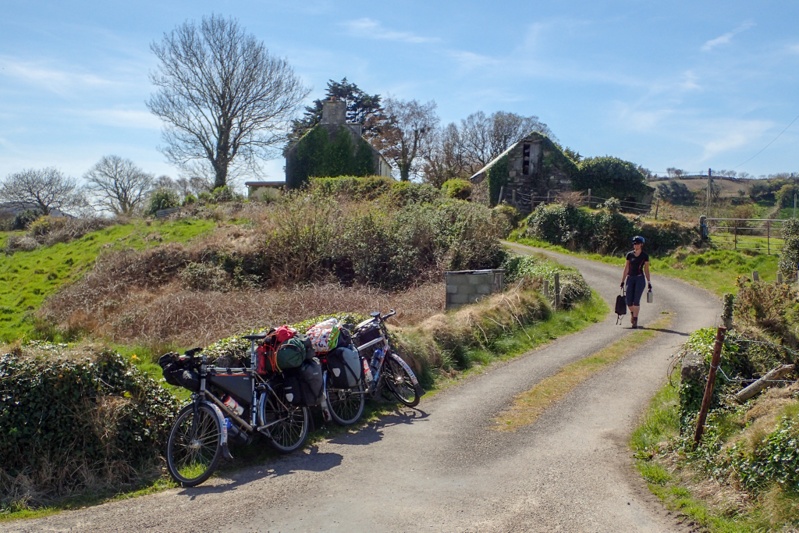 Just after Kilmakilloge Harbour we came across the perfect bush camp. Everything is fences here in Ireland, but along this road there was a stone wall and there was a gap in the wall through which you could access this tiny flat grass clifftop. We just didn't have quite enough water. We headed back to the cemetary a couple of km further back and asked the man who was mowing if there was any water (our experience is that there often is in churchyards). There wasn't, but he kindly told us about a friend's bore a little way back that we could get water from. The thing was, we found it very difficult to understand him. He spoke English but with a very strong regional Irish accent. So we kept repeating everything he said, "Go down the road here", "go right over a bridge" , "go to the end of the road" he must have thought I was a little slow! Water successfully retrieved (with only minor disturbance to cows sleeping in barn), we backtracked, thanking the man, Frank(?), as we passed him at the cemetary. We set up camp and couldn't believe our luck in this weather we are enjoying on the West Irish "Toes". If we were to expect brutal conditions anywhere, it would be here. We are Happy Campers!