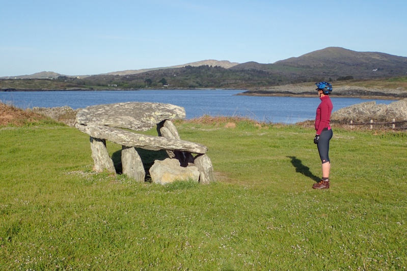 The Wild Atlantic Way actually follows the main road but our cycle route took some small farm roads as usual. Some had steep climbs, also as usual. The benefit of the small roads is that they often take you past things you wouldn't usually see. We saw a working water wheel at one point which seemed to be acting as a pump to drive a small mill or for irrgation. We then past a sign to Drombeg Standing Stones, just off our route. Although we had just had a long climb, it was only 650m or so down the road (and also down a hill) but we had not seen any standing stones on this trip and this was a wonderful stone circle with nearby remains of living areas. The people here had a kitchen where you could still see the massive trough which they would put stones in made hot by fire to boil meat. It was definitely worth the small detour. We had a couple of rain showers before stopping for lunch at another forestry picnic area. After Skibereen we decided to stay on the main road as we had had enough of the steep climbs and then the rain hit. We had only 22km to go to our campsite at Schull and stopped to put on rain jackets but decided against booties or rain pants, which was a silly mistake. We ended up cycling through heavy rain and so arrived at Schull with very wet boots. Our campsite is the same sort of thing as a certified site. It is in someone's garden so nice and small with only one stand for a campervan. We had stopped at the supermarket about 200m aways and bought cooked lamb dinner and lasagna for supper, which was delicious and we ate before showering. After this the sun came out! We will have a rest day here tomorrow as the good weather is due to last 'till Tuesday and this is a good spot.