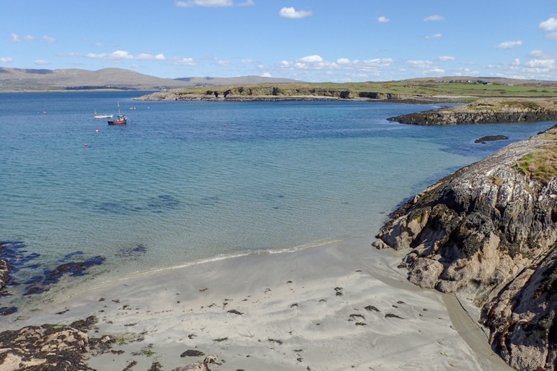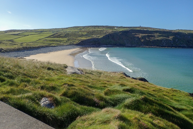 We came back via a more direct route and were a bit imaginative in turning off it onto a minor farm road after seeing two small donkeys. These are the first donkeys we have seen on trip, standing so seriously by the roadside. I took this as a good omen and it worked out well. We came out at a castle and a beautiful beach. Amazing to have a sunny day! The Wild Atlantic Way continued gently winding it's way along its picturesque route. We stopped briefly at Durrus which is the jump off point for the Sheeps Head Drive, which we weren't doing. Next stop was Bantry which is large enough to have a SupaValue and a Lidl, but still a lovely little harbour town. A few km's further on was our campsite. It is a large site but beautifully laid out around the shores of a bay. Very popular with families for this long weekend in the sun! We are camping WAY WAY AWAY from the action all on our own with lovely views of the hills. See the last pic for the view from our tent.