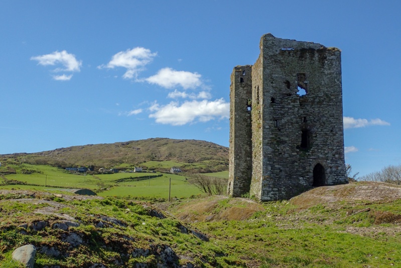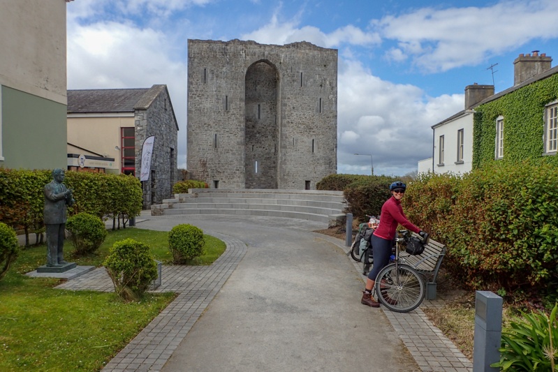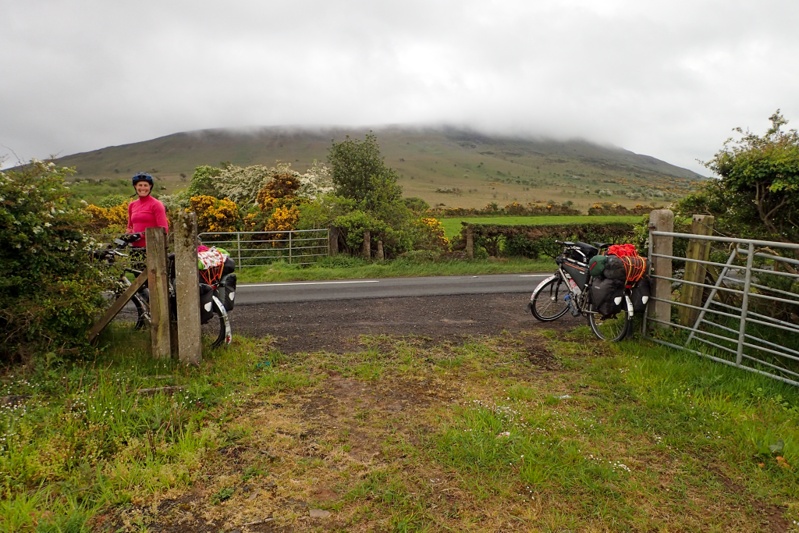 We stuck to small farm roads which were almost all in great condition and made for easy riding. We passed through the small village of Lixnaw and were amused by the sign on the wall of the pharmacy "Prescriptions/Veterinary Medicine/Beauty Products/Toiletries. No wonder the cows have such great definition around the eyes! We arrived in Listowel by 09:00 and were eating our hot breakfast on a sunny bench when a local came by for a chat. He was very interested in our bikes, being a keen cyclist and having toured before. We chatted for a while and commented to him on how friendly Irish people are. "With the exception," we said, "of KENMARE!!" He had a laugh and agreed. It seems they are known for this. He was so funny as he said they are only after your money and if there's not much they are not interested. He told a funny story about how you could ask the guy in the bike store about a particular bike's specs. and he would just say "Oh, the green one is lovely!". He said that there wouldn't be a farmer who would deny us a campspot on their land if we needed it. We had thought of it once before passing a great field with a wonderful view, but as Mike said, when you get down to it and start looking around it's pretty confusing to know which farmhouse to approach. The man said that over the last few decades, Irish farmers have become more affluent and so if you are looking for the farmhouse it's the big one down the end of the long drive. We often coomment that every house we pass is absolutely pristine and so well looked after. Many new houses are being built all the time as well. After this interlude we went into the main town square to see the castle. We walked right up to the big wooden door and tried the handle. "Stengt" as they say in Sweden (or closed in Ireland). We enquired at the tourism centre and it only opened for visit's on 22 May. Still, we got a good photo. Then we set off for the rest of the day. A few gentle climbs and gentle descents and one small Irish shower.