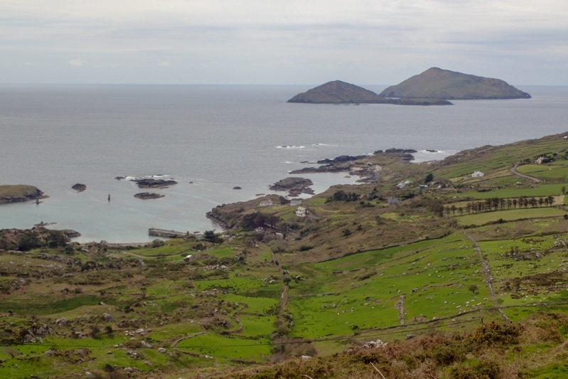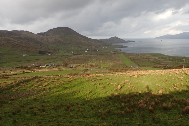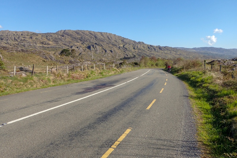 Cold start to the day as usual, zero degree C. We got going at 08:00, stopping first at the convenient Centra Supermarket over the road for fresh buns for the day. Terrific ride today! Scenery has changed to very rocky, the folded rocky hills are beautiful. There was no wind at all, we tripped along for 30km before stopping to eat at a roadside bench. The Wild Atlantic Way varied greatly from small and narrow to very wide. We had decided not to go to the tip of the Beara Peninsula but had a great ride through it and struck out into higher country as well with a couple of little well-graded climbs.