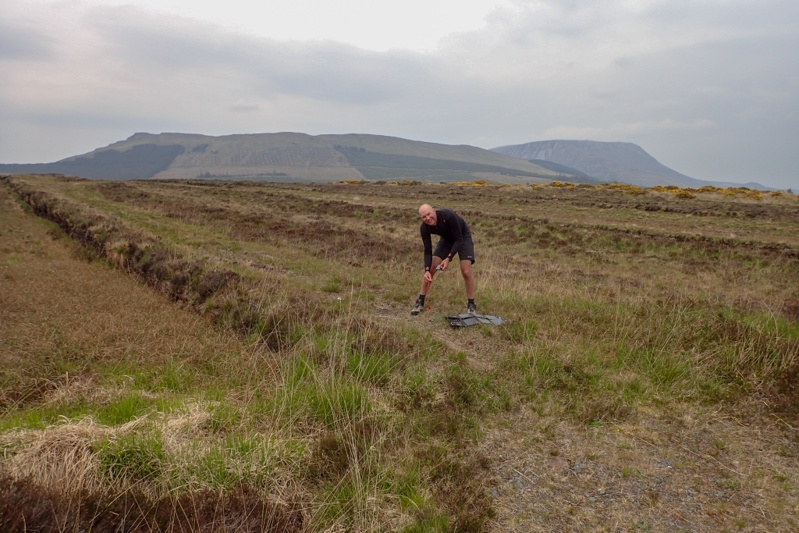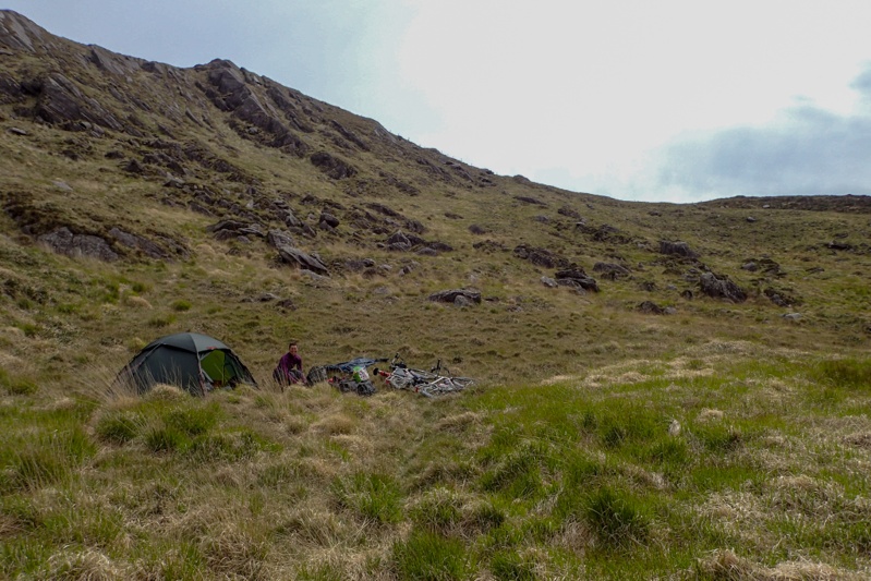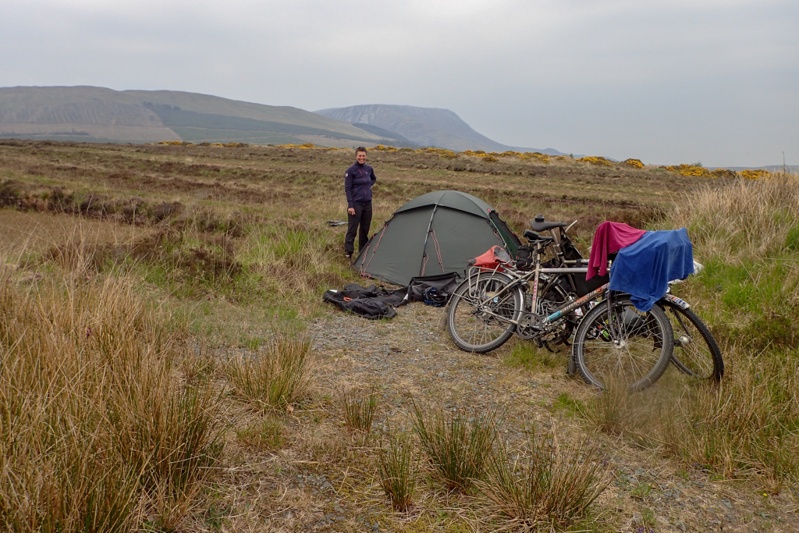 We stopped for a warm lunch which we ate when we came across a bench. After this we were back to busy road (which was in fact the cycle way) for a few kilomteres until we took the turn off to the Glenveagh National Park. This road was very beautiful. The first thing we noticed was Mount Errigal towering over everything with its scree slopes. Then we were into bogland and peat mining country. The road surface had been redone in parts and so the riding was great. A gentle uphill gradient to a height of 280m. We had planned to camp at a Lough about 20km further on, but when a bush camp presented itself along this road we could not resist. It even has a small mound of dried peat should we decide to make a fire (which we won't of course).