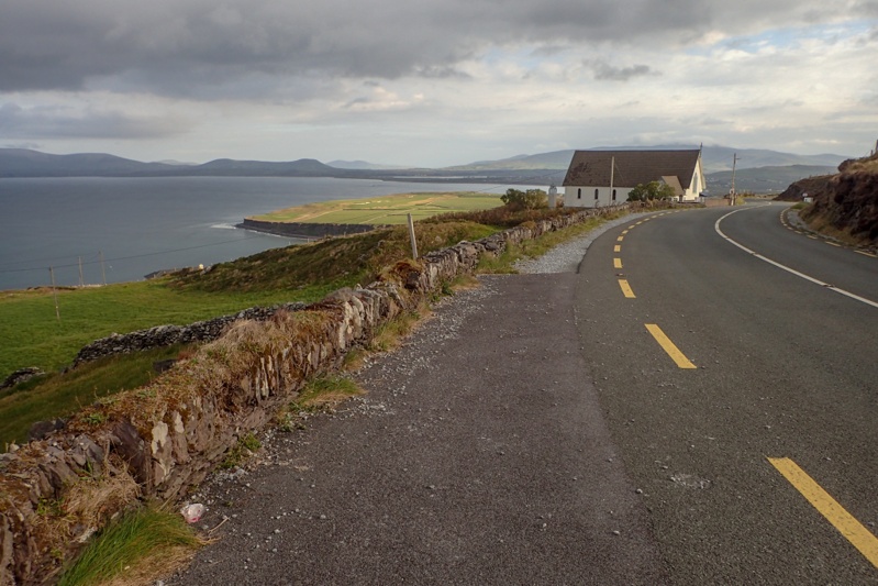 The weather forecast here is pretty accurate and so we were snug in the very well-equipped camper's kitchen until the evening as the rain fell. It rained all night until about 08:00. We had a short day planned anyway, which fitted in well with a late start. We left around 09:30 and had a climb out of the valley and then down into Tralee where we pulled in to the first pizza restuarant we saw and demolished two large wood fired pizzas. Yum! Tummies full, we set off again. Although the day was dry, it was a little breezy and in Tralee even the locals were walking about with down jackets on, tut-tutting about the weather.