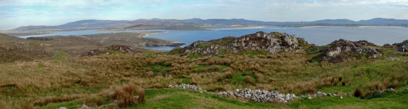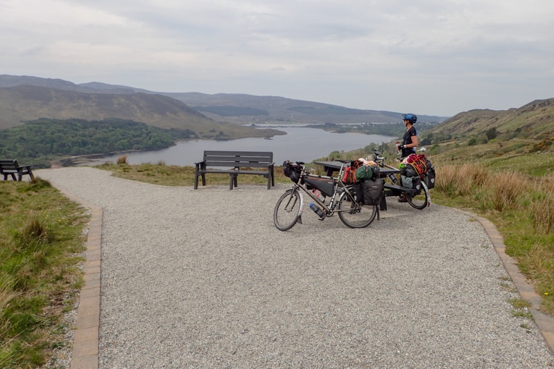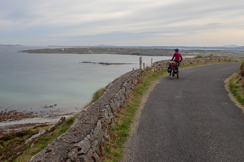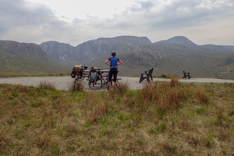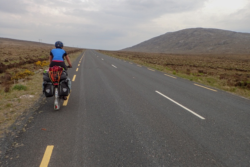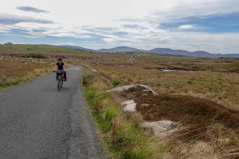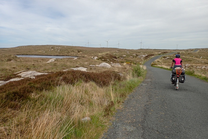 First plan for the day was to try to outsmart the midges, but they woke up when we did and made our lives a little challenging as we made breakfast and ate it and broke camp. A "nice" introduction as they may be present in numbers on the Scottish Islands and of course later on in Scandinavia. First stop was Donegal which we reached on a busier road which had a wide shoulder. We stopped to eat (as usual). Donegal looked a pretty town. We stayed on the same busy road after Donegal, choosing to abandon the cycle route as it did a crazy dance through some hillls. On the main road there was a stop-go for some road improvements and we nearly missed our turn off to Ardara. This was a beautiful stretch of road, gradually uphill though some beautiful country. Next stop was Ardara where we had lunch on the Gaelic Football Club field. The two guys busy attending to the fields were impressed with our progress. Even the smallest of towns and villages have a GAA club with its well advertised lotto draw up for grabs. Some places will say "This week's jackpot EU 24300. Others say "This week's jackpot EU 1200. The fields and clubs are always in tip top shape. After Ardara we headed for the hills through some beautiful bog country with some short sharp hills.
