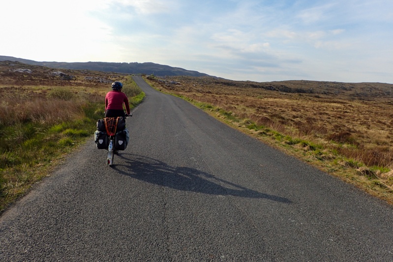 Beautiful views of the bog landscape as we dropped down to the National Park Visitor's Centre. We had some climbing through rural landscape and then shot straight down to Letterkenny where we shopped for food. After this our route took us on some crazy cycleway roads. The cycle route here is called the Donegal Way and we stopped to read the information board about it. They say that they choose level 2 and 3 county roads and are looking at expanding the route. We think it would be a better idea if they just stuck the cycleway on the National Road instead of looking all over for more challenging prospects. Shouldn't be unfair here as clearly if you are only going to do a 200 km cycle tour then you want the views of the farm landscape. We prefer to mix it up a bit.