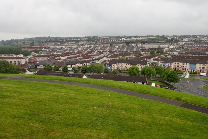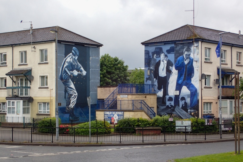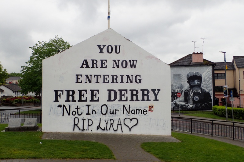 It rained quite a bit so we tried to be indoors as well as out, having a good meal inside, visiting the immense and important-looking guildhall and also I got a haircut. It is First Holy Communion Weekend in Derry this weekend so every hair salon was full of little girls having cute hairstyles with flower wreaths or fancy updo's for mums. Mine was a bit simpler I imagine. I chose a walk-in salon and had only a 15 min wait. As always after 5 weeks riding it's a little scary to be confronted with your face in the mirror, but I got used to the "outdoors" complexion by the end of it. We then finished walking the Wall and did some grocery shopping and withdrew pounds. We ended our time in the town with a walk around Bogside appreciating the murals and Free Derry corner. This was particularly interesting as the Free Derry painted sign is actually the gable end of a row of terraced houses that formed a street which was demolished in 1975. The gable end remained due to the significance of the sign and it's proximity to the Bloody Sunday events. We found it strange as of course you are taking photos of the murals and so on, and they are painted on the sides of regular suburban housing terraces. Take away the art and the explanatory signage and boards and this could be almost anywhere in the UK. It felt a little like an invasion of privacy for the people who live here, being observed by groups on walking tours all the time. But as a local assured me, they have a sense of pride about it all so they don't mind and are used to it.