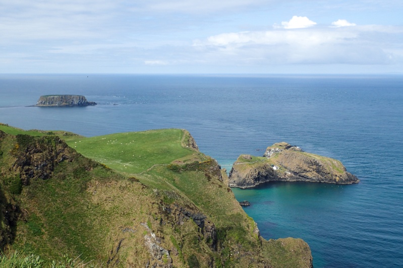 We woke after a sound night's sleep. You forget how silent a hotel room can be. We had a restful morning and left at check out time, 11:00. It was only a 38km ride to our ferry at Ballycastle. The weather was good and the ride out of town was along a good cycleway that our hotel happened to be adjacent to. After only a few kilometers we reached Bushmills, a famous whiskey distillery and then the short rail trail along a heritage railway to Giant's Causeway. There were quite a few tour buses and people were intent on scurrying up over the hiil to inspect the feature. It's a confusing place as there are quite serious signs up telling you to pay GBP 12.50 per person for admission to the Giant's Causeway Experience and Visitor's Centre and that your admission evidence would be checked on the way out, but then you can also walk up the hill before the visitor's centre to view it all free of charge.