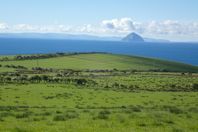 Things were not ideal last night as it was a late night, only pitching the tent after 20:00, the MIDGE SWARM and not having a shower/swim. Anyhow, we slept like logs and then woke to negotiate the bugs this morning. We did not get bitten due to experience and luck but they were quite off-putting. The good news is that the repellant cream (from our Canadian trip) we use on hands and faces (eveything else is covered) works like a charm. At least one positive aspect of midges is that being on the bike is far more appealing than hanging around your campsite! We set off at 08:30 for the ferry from Claonaig to Lochranza - Isle of Arran. Wow, the little coastal road up from Campbelltown had one brutal climb after another. In between there was a nice interlude with a single lane road that mozeyed on up a river valley (still uphill) but afterwards we were back on crazy road. Warning signs grew progressivley worse - 12% incline, 14%, 16%. The weather was great and the views beautiful. We reached Claonaig in time for the 11:20 crossing and got off at Lochranza. What a gorgeous place with it's lovely castle ruin. There was a long climb and then a descent into a lovely Scottish river valley and we stopped to refill all our bottles with ice cold water from the clear stream. After this it was flat riding around to Corrie and then Brodick, the main settlement. Arran is really worth a visit. Everything is quaint and pretty and there are benches overlooking the coast everywhere. It's a lovely place.