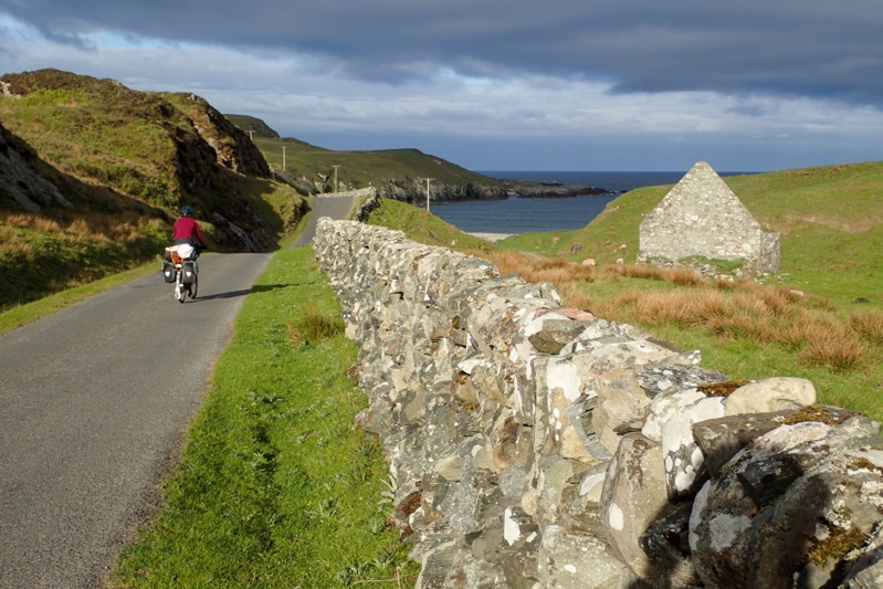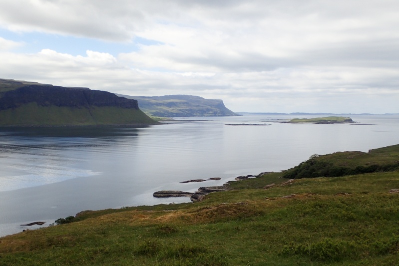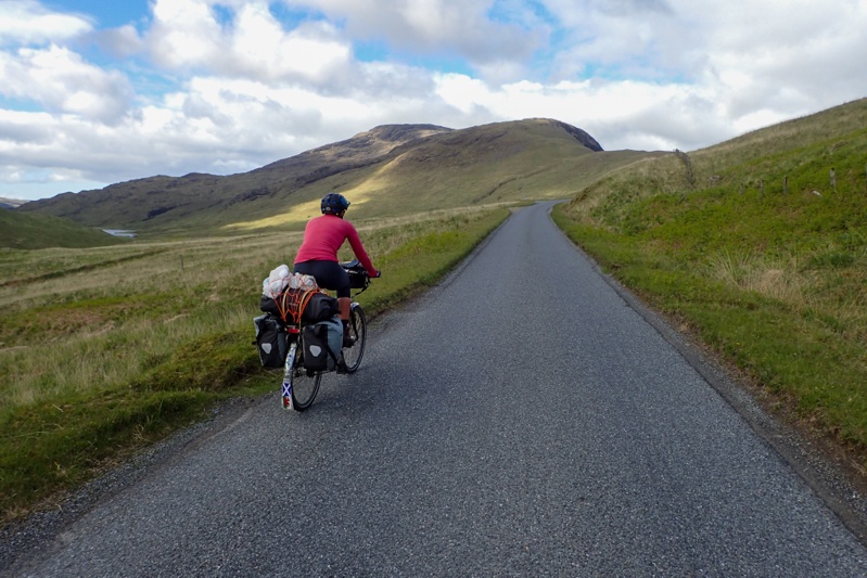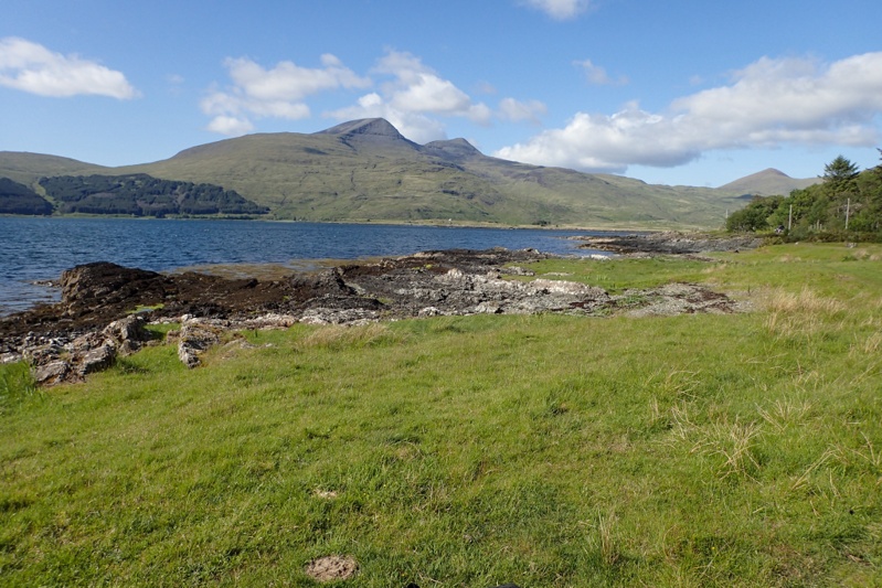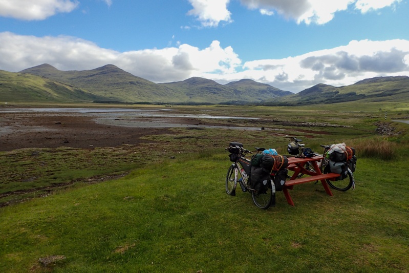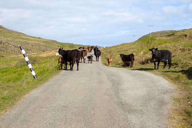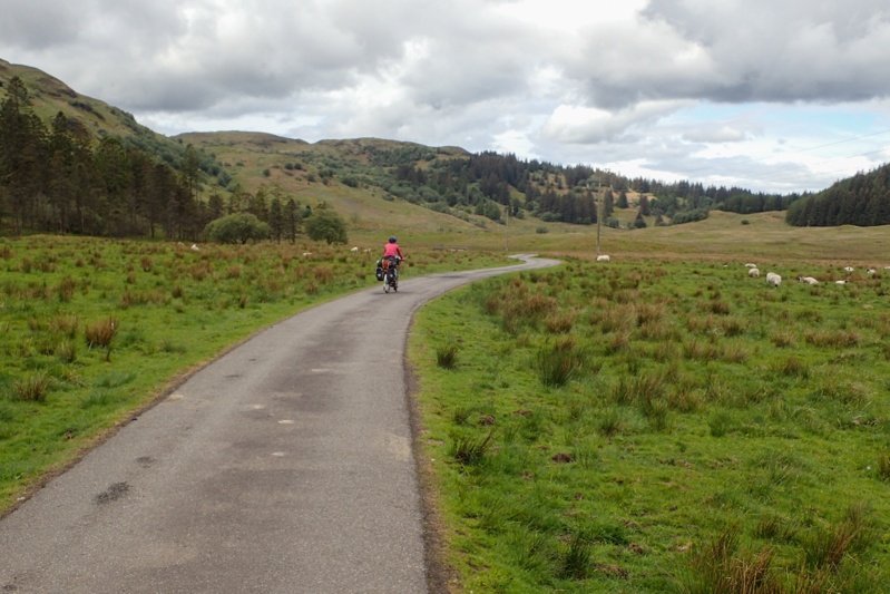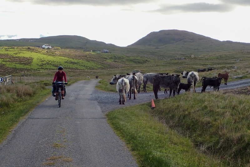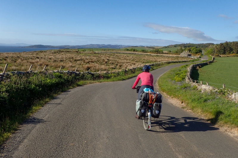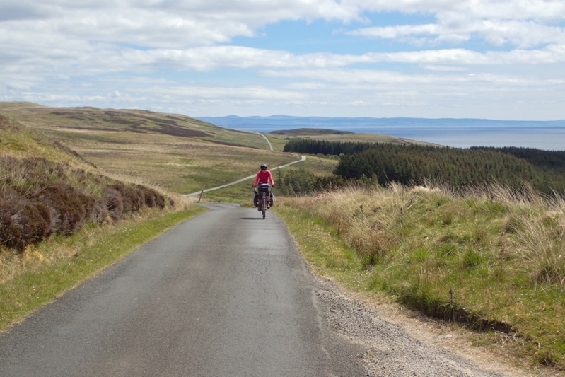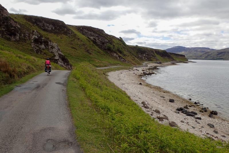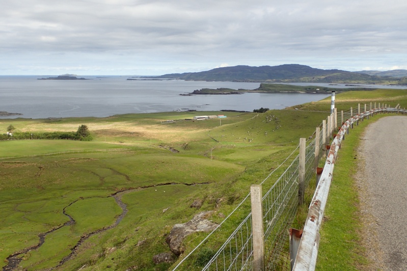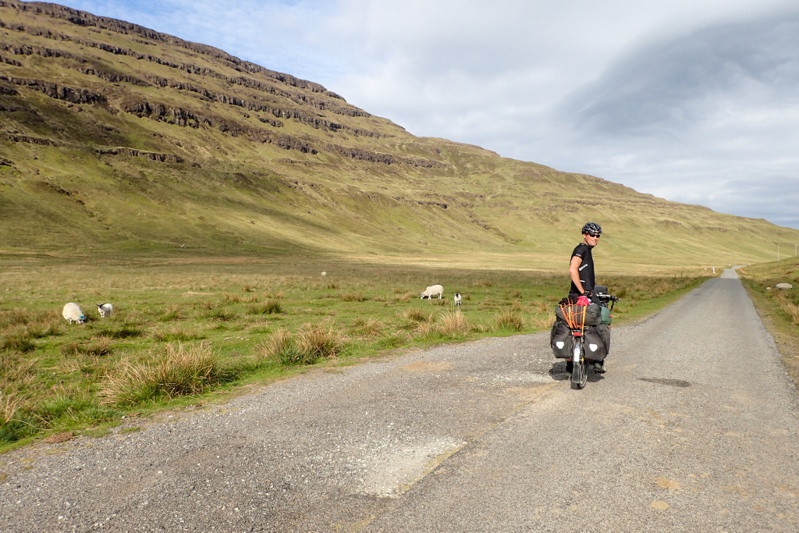 Although our campsite was pleasantly midge-free last night, we woke to a bit of a midge problem this morning. I found that my new midge net worked well though. The weather was a little overcast and we expected rain tonight, but it was quite still most of the day with a slight tailwind if anything. The views were beautiful as we began a long but gentle climb away from Pennyghael. We were hoping that the road would be quieter as we worked our way up the west coast and it certainly seemed to be true for the first few hours. The main traffic was a herd of cows walking slowly up the road. We had a great descent and then the road continued along a flat section of coastline for quite a way. Huge selection of wild campsites, sheep grazing along the road. There are no towns or shops at all along the west coast of Mull, but a few settlements.