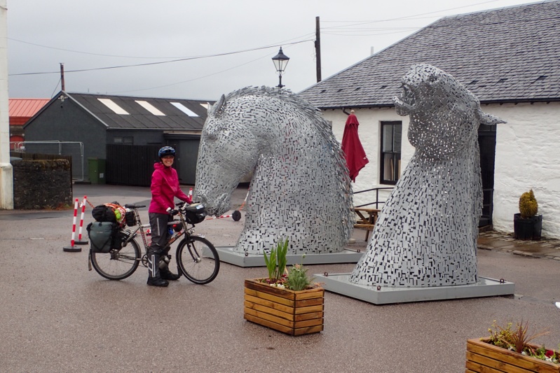 It was a good decision to have a rest day as it rained heavily for much of the day. We were a little disappointed to wake up to find the dreaded midges had moved into our tent (well, under the tent outer) but once the rain came they shuffled off. Otherwise a relaxing day. The rain lifted a bit for us to have breakfast and then returned, mainly squally showers and then drizzle. It was interesting that the dry stream bed that ran alongside our camp was running this morning. As we were getting ready we heard a greeting from the road and there was a man walking with a big pack on. Turns out he is from Bristol and is walking around the coast of UK. Not all at once, in sections. At the moment he is walking from Tarbert to Oban and will then take the ferry to Mull, same as us. We waved him on his way with a promise to see him on the way. It was actually a bit of a novelty, riding in the rain. We have not had proper rain in about three weeks! The scenery is very different with cloud and drizzle. We had a very reasonable and enjoyable climb along single track road and then a descent into Lochgilpean. Just before we reached the village, we hit the Tow Path which is a Canal Path running to Crinan, with 17 locks to pass. We love a good canal path, so thank you Scottish Canals! At the start of the path I posed for a picture with the actual scultpures maquettes (1:10) of the Kelpies which we will see in Falkirk (near Stirling) way in the future. It was pretty cool, see pic. We shopped in Lochgilpean and then continued on the tow path for about 10km. We could sit and eat at a bench in the fine drizzle.