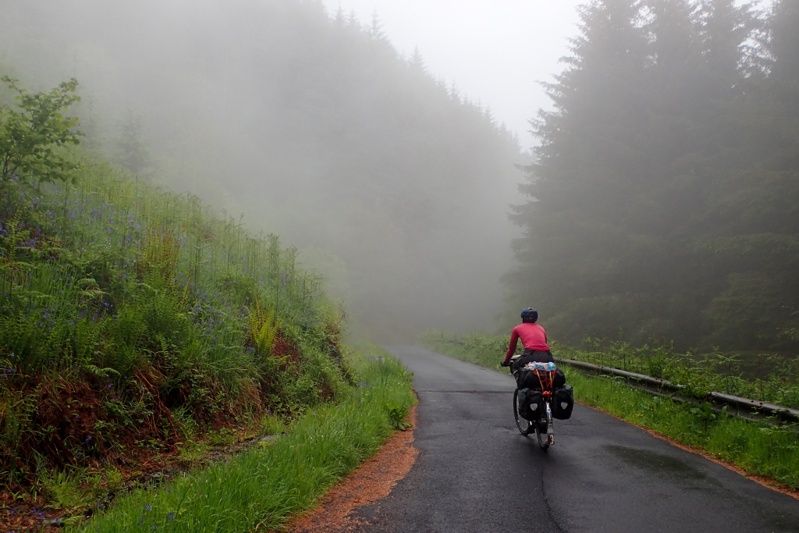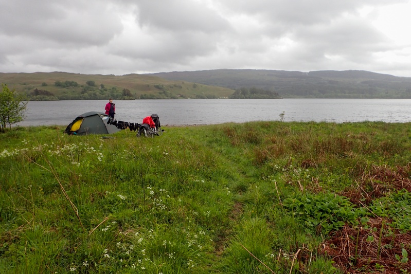 The next interesting thing about the route today were the number of ancient burial cairns around the place. We stopped at three and could have stopped at more. They are all sort of 5000 years old and right on the road so you can just have a look as you ride past, or get off your bike and go in to have a look. After these points of interest came the big climb of the day which was more difficult than the first. The road was very quiet and very narrow single track but very good condition, and passed though so amazing old forest scenery. Ancient trees covered in lichen and moss. Mist rising up ahead and rivers in full torrent. All in the driving drizzle and rain. We felt this was a true Scottish experience! The climb continued longer than we would have liked and at the top we put our rain jackets back on. We don't wear them for long climbs as the amount of sweating you do in a waterproof jacket as you climb off-sets the rain being kept off. As we did so we were surprised to see a family come by on bikes. We had seen them earlier at the stone cairns. Dad had two kiddies in a cart behind and Mum had a couple of panniers and a tent. It just shows you that people who want to cycle tour will find a way. They looked as wet as we were. Just as the descent to Loch Awe ended we spotted a path off towards the Loch which provided good access for our bikes and the pick of camp spots. The rain had just stopped by then for our first loch swim of the tour! Wow, it was cold! The afternoon was pleasantly dry (sort of).