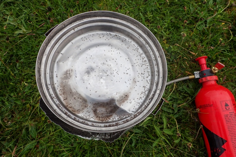 We were so impressed with our bush camp at Loch Awe that we called it Loch Awe(some). It had been windy when we arrived and rained very heavily overnight but the morning dawned absolutely still. The Loch was a mirror. The midges were in midge heaven. As we woke up we saw that they had absolutely covered the underside of the tent cap. We decided to get up as usual (with full midge protection of course). As we exited the tent we understood the situation better. We have never seen clouds of midges like this. They grew very excited to see us and swarmed us, so that when you looked at the other, their clothing was completely covered up with midges. It was highly unpleasant. Nevertheless we thought there was wind forecast and now and then a breeze came off the lake which sort of got some of them to leave, but they returned with a vengance. We realized since after discussing matters that we should just have got dressed into our cycling gear in the tent and left and then had breakfast along the way somewhere. Anyway, we managed to pack up. Everything was covered in midges. As an example see the pot lid in the pic below. They flew and crawled into everything, the paper towels were encrusted, they flew into your tea as you drunk it. What a debacle.