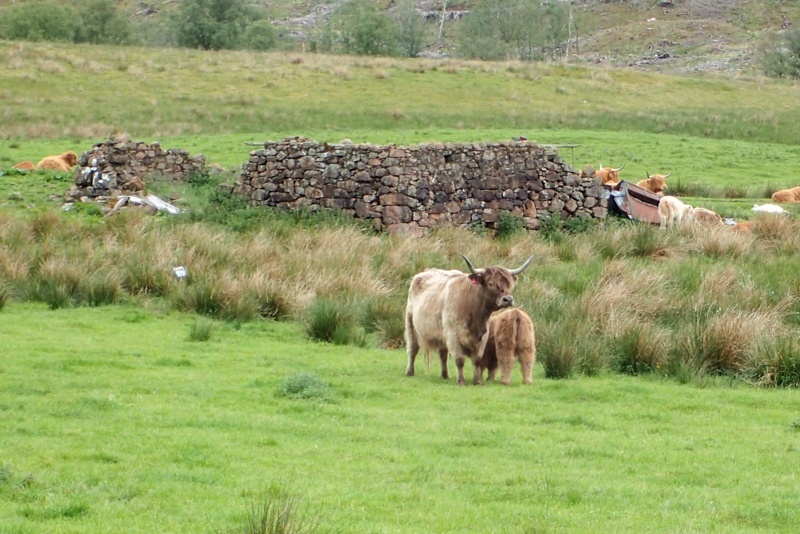 We had a great night's sleep on the sheep field and woke a little earlier. We had a 53 km ride to Port Ellen and the ferry back to Kennycraig. We are due a rest day and also expecting rain tomorrow so decided to have a rest day at the campsite we reach tonight. This would be sometime after arriving at Kennycraig and as there would be no shops after Port Ellen we had to stock up there for the rest day. We got going just after 07:00. With the weather today you could not believe it would be raining tomorrow! We first did a loop towards and around Portnavan. Islay is very beautiful and the scenery was stunnig this morning. The road just twisted on towards the coast. At one point far ahead we could see many cows and their young slowly wandering unaccompanied in the road up the hill. We slowed down behind them and crawled along. They were not unhappy about us being there. Later on one cow would not budge out of our way and gave us the hairy eyeball as we passed, hurrumphing for good measure. One has to be careful with cows, they can be unpredictalbe, especially with calves about. We see alot of dark silvery grey coloured cows here and they are very atttractive! Portnavan is a lovely cluster of houses. The bus passed us there. As with Arran, Islay has a fabulous bus service. It is certainly possible to travel without a car on the islands, just with a backpack and using the local buses. We passed a farm of hairy cows - Hebridean Cattle. They were both the tawny orange colour that you are familiar with and also dark brown.
