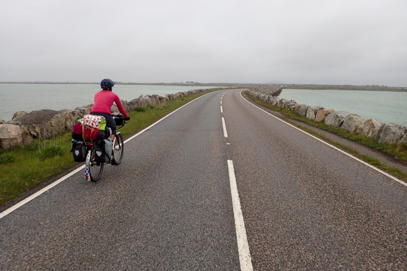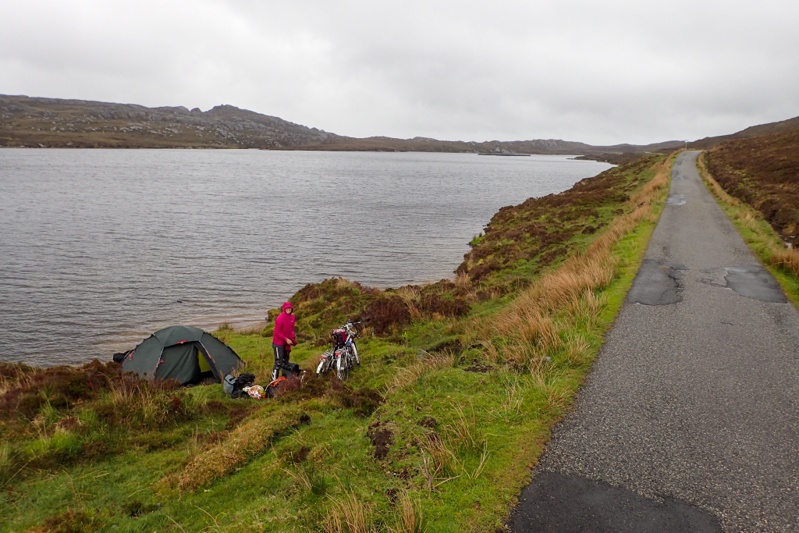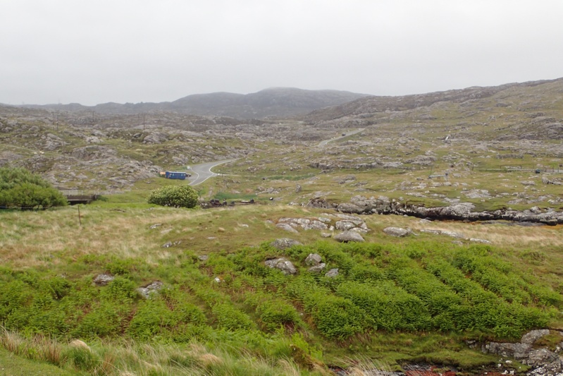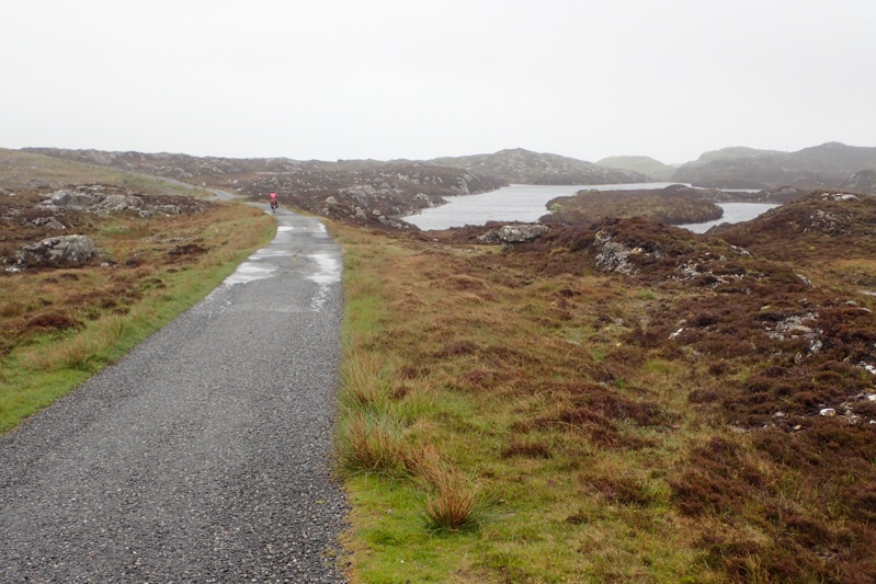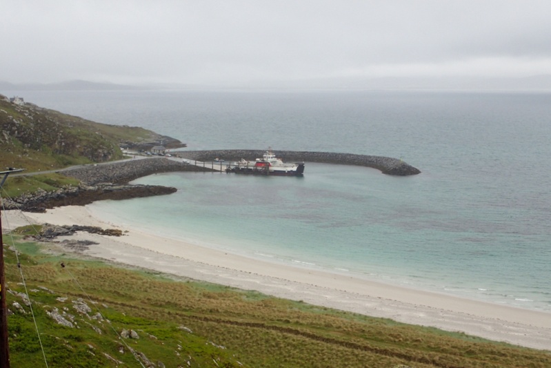 Not much to report today. The riding was flat and easy and we still had that tailwind which is such a help, especially in the rain. We crossed a few causeways today as the islands of South Uist, Benbecula and North Uist are all linked by road. It rained quite a lot and so there was not much of a view over the coast. We stopped for flask coffee on Benbecula and started thinking that we would be able to make the 13:00 ferry to Harris, as opposed to the 16:00 which we had been planning to take. With the raging tailwind we could do it. Our average speed today was over 21km/h which is a very rare thing on a cycle tour, so that proves the ease of riding. We did push hard though and did not take breaks. We were hampered in our progress by the single track roads and a tractor rally, of all things. You would see a string of 6 to 10 tractors coming towards you and then you would have to wait in a passing bay, losing all momentum. We got a bit cross about this. Anyway, we arrived at the ferry terminal with an hour to spare as the ferry actually left at 13:30. We had a sandwich in the waiting room. It is really nice that they do supply great waiting rooms at all the ferry terminals here, makes a big difference! The ferry trip across the Sound of Harris was 50 min and then we went to the grocery store for a spot of shopping. Shops are closed on Sundays here and that's tomorrow so we had to pick up some supplies. There are two routes to Tarbert which is where we leave the Outer Hebrides (we visited Lewis which is the the last Isle when we were here 4 years ago) the western road and the eastern one. We have decided to ride the eastern road which is more picturesque and hopefully quieter, we are trying to avoid traffic on the single track roads. We found a campsot on the Loch shores. It was still raining lightly when we had our swim but there is heavy rain forecast tonight and tomorrow morning. We still only have 25 km or so to ride to Tarbert from where we will get the ferry to Skye.