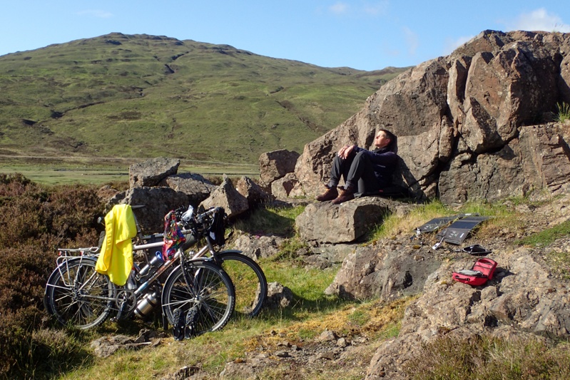 By the time we reached Portree the rain was mostly over. We stopped to buy food for lunch and ate at a bench at the harbour. We left Portree via a minor road east to Bracadale. This ride had some short steepish climbs to start with, but the scenery was superb through bog and hills. As we descended into Bracadale the cliff tops of the peninsula were clearly visible. It turned out to be a beautiful day. As we stopped to rejoin the A road towards Sligachan, off-duty Policeman Dave caught us up on his bike. He was such a great guy to meet! We had a good chat about bikes and touring. He lives locally and the road we took from Portree is his daily commute to and from work! Lucky man (at least when the weather is good)! We had a laugh about a few things, including the people that shuffle out of their cars in Portree to look at the shops and then shuffle back into their cars and move on. Then they go home and say they have seen Skye. He also warned us about people driving on the wrong side of the road (from Europe). As if we did not have enough to worry about! Anyway, it was so nice to meet him and share in his enthusiasm! After this, the road to Sligachan was also easy on the eye, full of massive views of the Cuillin Hills in all their glory. Shortly after Sligachan we found an amazing bush camp high up on the ridge near a little waterfall. We had a great afternoon and evening sitting on warm rock ledges in the sun after our creek swim! The spring high tide that Dave remarked on seems to have caught a bunch of sheep grazing on low lying land in the bay below unawares. The waters rose until tiny islands formed, growing ever smaller. There were Mum and Bub sheep on a few of these. Eventually one Mum and two Bubs made a break for it, swimming/jumping/wading through the water to safety. But as I write there is still a stranded Mom and Bub who look as if their island has all but disappeared, and they're knee deep in water. We checked online and the tide should just have turned so they should be alright. Stay tuned.....