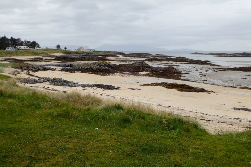 Just before bedtime we checked on the stranded sheep situation. The doomed island was reappearing and the sheep would have been alright (communal sigh of relief) but we could not see baby sheep. Must have been there still, probably a shivering heap of wool under mother sheep. We know a lot about sheep having observed them closely for two months on this trip and cummulatively from other trips, who knows? Sheep are not very affectionate parents but they are dutiful and we feel sure she remained on the doomed island with her baby. Anyway, when we woke today you would not believe that the landscape you were looking at was the same one as last night. Last night it was all just sea and today it was all green grass. The spring high tide was over 5m so that is dramatic. The sheep all looked present and accounted for. Sheep drama over. Weather drama commences. The weather report for the Cuillin Hills on Skye was "rain falling as sleat, winds NW 45km per hour, with much higher gusts". Crap! The wind was a worry although we were travelling in a southwesterly direction there were short sections when we did ride north which could be very difficult in that wind. Our campsite was well-sheltered from the wind by a rock overhang, so you couldn't really tell how bad it was. We were very organised and up early, packed the bikes by the roadside and were off by 07:15. The riding was mostly easy with one long climb but the road we were on for the first half was the main road with a very good surface. We did not have the dramatic scenery that we did yesterday but it was still very beautiful. To our relief the wind was nothing to speak of really and the the sleat stayed away. It rained off and on. We rode non-stop for 51km to the Armadale ferry terminal to get the ferry to Mallaig. Some of these ferry services are effected by tides on certain days and today would be one, which means that three ferry services for late morning and early afternoon would not operate. As we turned onto the road to the ferry terminal (still with 20km to go) the digital service board read "DISRUPTION" so we called the number wondering if the ferry was cancelled but the guy said no, all was well, it was just referring to the issue with the tides.