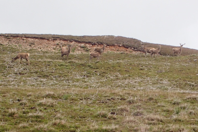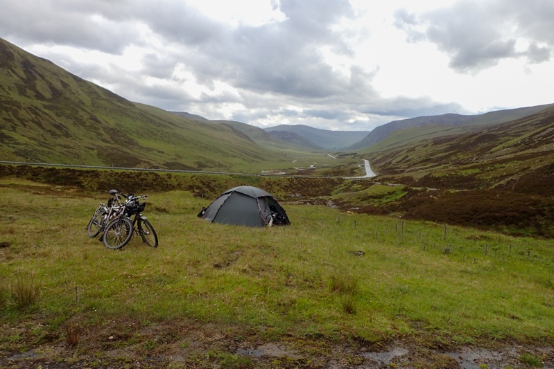 We stopped at pretty Ballater on Deeside for brunch and then crossed south over the river, following a minor road and roadsigns with Queen Victoria's profile. They don't actually advertise Balmoral on this road, you draw your own conclusions from these signs. The weather was quite changeable, cloudy then sunny and so on. It began to rain so we put on wet weather gear only to take it all off again 2km further on in bright sunlight! You can't really complain about that can you? We really loved the road we rode from Ballater until Braemar, it was so picturesque with forest all around and a gentle gradient. We came across the entrance to Balmoral on a bend and took a photo. A man on gate duty kindly came to speak to us to say we could take our bikes in with us and looked a little taken aback when I told him we weren't planning on going in as we were trying to beat the rain that was forecast for this afternoon. We stopped again at Braemar which is also a quaint village and bought food for supper. After this we followed a small single track road directly south into the headwind we knew was coming. The forest was now behind us and we were surrounded by highland heather-strewn hills. We were still following a river upstream, now the Clunies as we had followed Dee upstream all day. We had been climbing at a steady 2% gradient all day mostly and rejoined the main road to continue this climb to a height of nearly 700m. This is actually the highest point we have reached all tour so far. The road was sublime, the climb was a piece of cake, it was mainly sunny, but we had the headwind we had been due for months and kept managing to escape! I really struggled as I do going uphill into the wind and the last 10km of the day were a major countdown! We rested at the Glenshee Ski Area and reached the top of the climb just after, dropping down rapidly for about 3km until we found the perfect bush camp just along an old road with a collapsed bridge. We put the tent up rapidly as the rain was coming and jumped inside before heavy rain hit. We had arrived just in time to miss it! It was 14:45 but we had left camp this morning at 07:00, so still a full day. It had been a great day, except for the wind over the last 10km. We would highly recommend this route. We will have nearly 100km tomorrow, still south and the headwind will still be a factor. After the rain stopped we had a COLD river swim! Later in the afternoon we watched a herd of deer (and some sheep) just on the hill behind us.