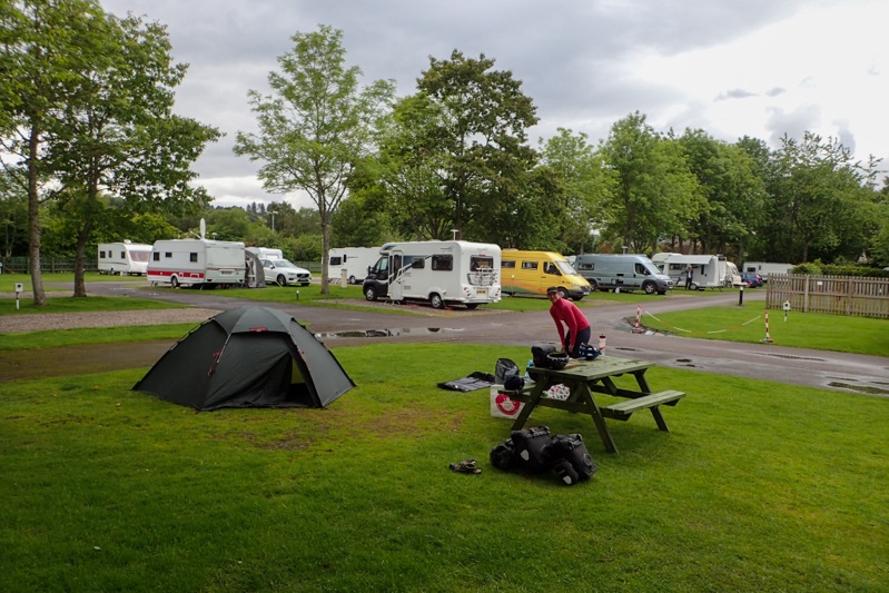 As we neared Dingwall we could see a thunderstorm and rain about (like yesterday) and we were sprinkled on, but not for long. The roads were wet in the town though and people commented to us on the rainstorm that had come through as we were almost dry. The campsite is just at a huge football stadium and the train line. It is another Caravan and Camping Club site and very nice. We did the laundry and then the rain bucketted down for a few hours again. We were pleased to be in the tent.