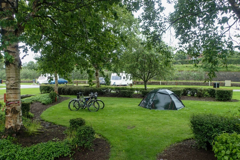 After some time on these rough tracks, we were back on the road and the kilometres passed more quickly. We did feel quite tired, although there was not much climbing to do now, just some up's and down's. We sat at a bench before Bedford and Mike did a quick check at the route to see that we could change it slightly to get to a campsite further on which would be worth it to shorten tomorrow's riding time. We decided to go for it as the weather was lovely and sunny and although we had had a headwind all day we could manage the 24km. It is always encouraging to see road cyclists when you are touring as you can then anticipate an easy route, which this was. We saw Bamburg Castle from afar and it looked very impressive. We arrived at our campsite at 16:00 and as we left this morning at 07:15, it was a long day out, but we had done what we had set out to do. We would now only have 35 km to ride tomorrow so we can pick our time to avoid the worst of the rain and then the next day to the ferry to Ijmuiden is still 52 km; quite cruisy. The campsite is good. We must say that we do like the Club sites.