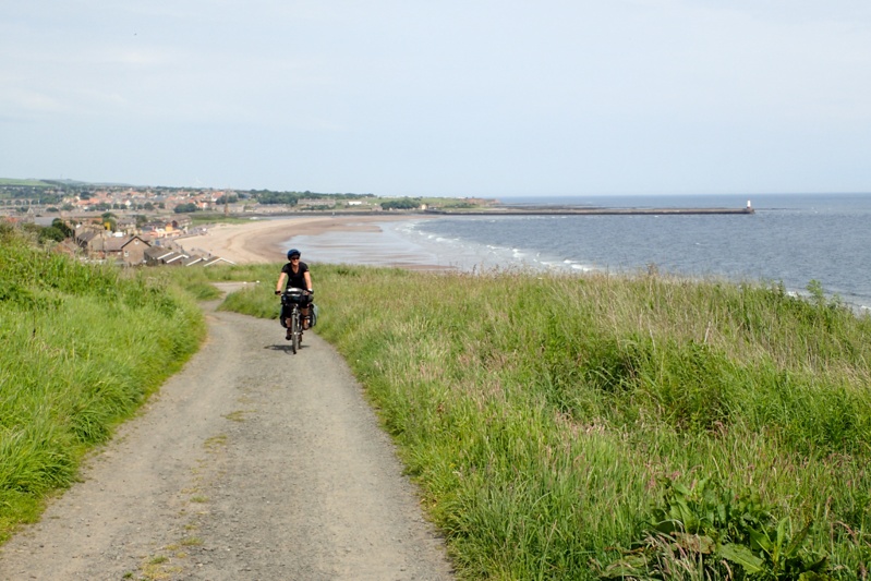 We have been keeping an eye on the weather forecast as it was for heavy rain today but it ended up coming through overnight and rained hard. We were the only tent at the campsite and many of the early dog-walker caravanners expressed concern that we had survived the conditions! By 07:00 the rain had stopped but it was very misty. We decided to get going anyway at about 08:30. Last night just before bed I innocently asked Mike for the website of the campsite we were going to today. It is a farm stay place just near Cresswell on the coast which promotes itself for cycle tourists and walkers. It has a dorm style set up as well as campsites. When I looked at the website though I noticed it only opened for camping in July. This in turn created a whole lot of issues as there were no other options for camping anywhere between there and the ferry in North Shields (Newcastle). This might sound crazy but it is true! There are many static van parks but no campsites. So we started looking at Premier Inn Hotels and there was one a bit further on, and then another even further and then one 500m from the ferry terminal. We were thinking mainly that the closest one at Ashington would be the right one as we had done the extra riding yesterday and were a bit tired. Anyway, we set off with that in mind. First decision came on the way to Alnmouth where we had to choose between the coastal route and the inland road. We took one look at the coastal route bouncing off into the mist, all potholed and puddley and went inland, even though there was a bit of a climb and some extra distance. We are wise from hard earned experience!