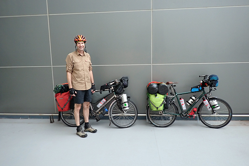 We arrived at Adelaide airport and found our usual out of the way spot by the smokers corner to put the bikes together by 15:20. This went well, until Mike got to pumping up the tyres with our trusty Lezyne mini-pump and found that the air was escaping somewhere. Adelaide airport has bike facilities with storage and a bike station, complete with rusty tools and a dodgy-foot pump, but we decided that obviously we needed a workable pump to take with us. It was 16:40 so there was a bit of urgency as shops tend to close at 5 pm. Mike took a cab to a bike store 7km away, bought one and was back in half-an-hour. while I sorted out our gear. We ended up getting on the bikes around 17:45 and left the airport with only one or two wobbles! At the start of a tour the weight on the bike always makes us wobble a bit. The roads were quiet and we soon hit the Torrens River cycle path which is excellent and we are sure also pretty, but it was dark and our bike lights were firmly fixed on the path ahead. We got to our campsite after 19:00 and enjoyed slightly soggy Subways purchased about 2 hours earlier at the airport. Our new sleeping bags were good!