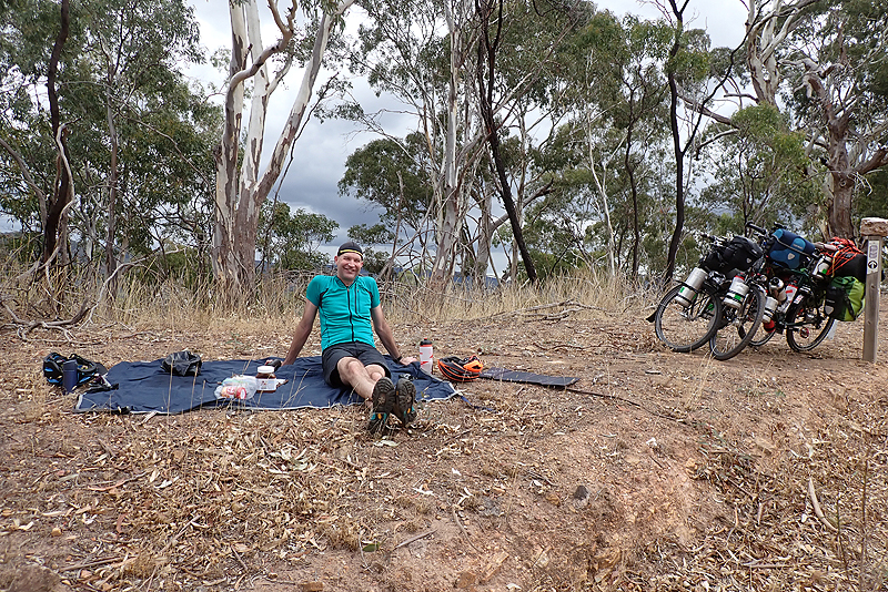 We had taken a gamble on the first 10 km of the path until it joins the gravel road in the park being better than the bit we walked/cycled yesterday, and it was, but not by a huge margin. It still took 2 hours to cover the 10 km. We met a pair of cyclists who would complete the Mawson today. They had a set of parents taking their gear today so were not carrying much and had quite different bikes to ours. They were friendly and a little amazed that we had managed that bit out of Adelaide. We were too. "Managed" is an overstatement, we really only survived it. We met the set of parents later on when they passed us in their car on the park road. We stopped for coffee just as we got into the park at a picnic spot. We had a further 20 km to cycle in the park. The road was gravel and quite rough and ready in parts but very good. Some steep little climbs to get the heart rate up, but all rideable. The motorists were without fail very patient and would often slow right down to lessen the dust cloud. The park views were spectacular. We are really pleased to have had this experience of riding the park. Each small campsite or pit toilet and even the info boards near the entrance has a tiny water tank so you can always get water which was great. We are just using the Steripen on this tank water as it is crystal clear (instead of filtering).