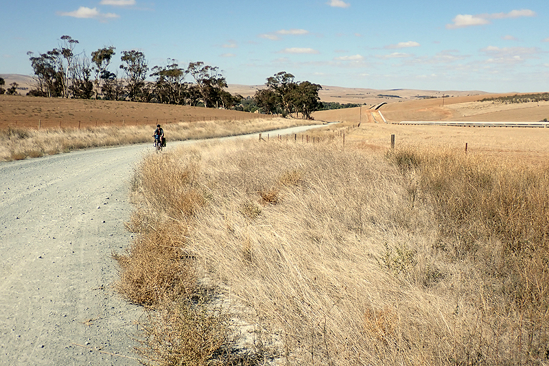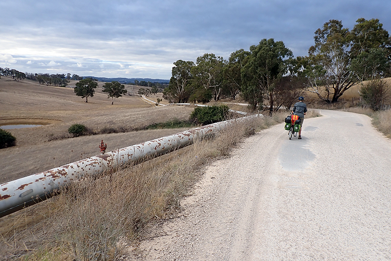 Minus 3 degC this fine morning when we got up just after 06:00. We went to make breakfast at the camper's kitchen and when Mike returned to pack up the tent it was iced over without our body heat inside. Beautiful clear day as we set off at 07:30 again, following the rail trail to Clare and then picking up a great farm road to Spalding. We deviated from the Mawson Trail here which went off into the eastern hills just to loop back to Spalding. The farm road was a mix of bitumen and good-ish gravel suface and we had an excellent first half of the day. Spalding offers entertainment in the form of the "Biggest Display of Barbed Wire in the World". Other than that, a perfect tiny village. We went off into the hills here, following the Bundaleer Water Pipeline as it snaked across the rolling hills. A note to other cycle tourists is that you can pretty much camp anywhere around here. Even when the paddocks are fenced there is often a very wide bush margin and easy to find a place to pitch a tent. One gets the feeling no one would mind. Local motorists are friendly and most drivers very accomodating.