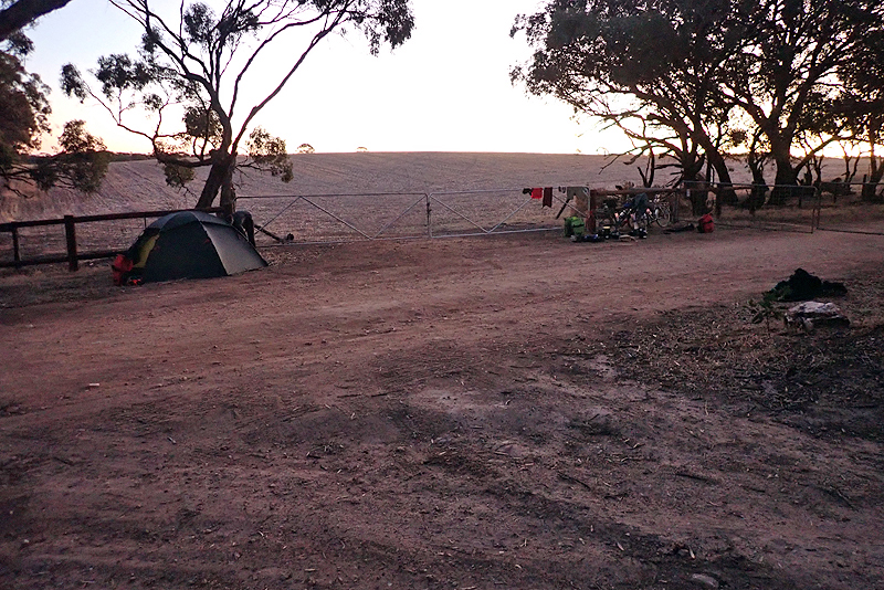 The roads have dedicated cycleways and it was good to see some civilisation. After Nurioopta we are back on all sorts of farm tracks, gravel, sandy, heavily rutted from water, and my special favourite which was rocks just strewn everywhere. But it was ALL rideable at least. Sometimes quite slow. Had a fall on a sandy patch, hopefully that is my fall for the trip over with. We reached Kapunda and headed out again for about 8km to reach a campsite on the Heysen Trail (walking trail) but about 1km from it there was a locked gate and the sign said it opens 30 April. We decided to camp right at the gate as the place was farmland and quiet. We had picked up some water at Kapunda but as there was a water tank at the campspot we had not factored in extra water for showering. Amazing what you can do with a couple of litres though! Good training for later on in the trip. As always when we camp in this sort of place we say "What are the chances someone will come though the gate?". Lucky for us about 30 min after we had both showered along came Farmer Joe in his rattling farm vehicle. He was so friendly and obliging and even offered to let us through the gate to the water tank. As he was going into town he offered to get us something and also was happy to help with firewood. People surprise you how obliging they are. We didn't need anything, other than our bed. We arrived before sunset so that was a win!