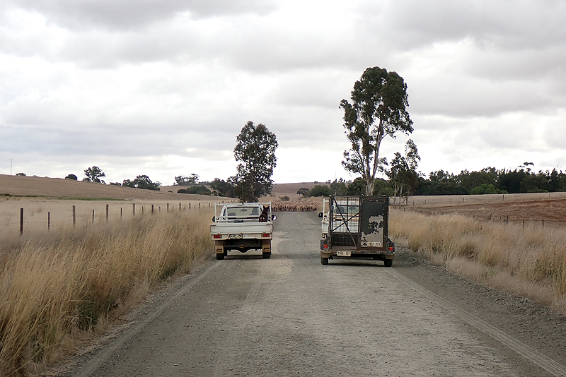 First part of the day was a mix of smooth bitumen, sandy track and a technical rocky section that the track designer obviously included for a laugh, but we weren't laughing! We could see some pretty black weather fast approaching and the head wind was strong. We descended pretty quickly down a gravel road into the Clare Valley. Then we got stuck behind a large flock of sheep being moved to another paddock. Two men (shepherds?) were herding them down the road in utes. The men, not the sheep. It was a crawling pace. We asked one guy how far they were going and it seemed quite a way. "If youse are in a hurry," he said, "we can move the sheep into a paddock, and then get them again", but that seemed like a massive effort to us city dwellers. Anyway, the second option was "put your bikes on the back of the ute and I'll drive you through a paddock to overtake the sheep", but that seemed like quite an effort for us. We said we weren't in a hurry but wanted to beat the weather, so the compromise was that shepard offered to open a farm gate to a paddock which allowed us to race along the edge of the paddock on the opposite side of the fence to the sheep, so we could overtake them. All good in theory as the sheep were going berzerk on one side of the fence, while we raced them on the other. Eventually we won, and passed the large flock. While we were racing the sheep, shepard was racing us directly through the paddock so he could open another gate so we could get out ahead of the sheep. All good. Cycle tourists happy, shepard happy, and shheep happy!