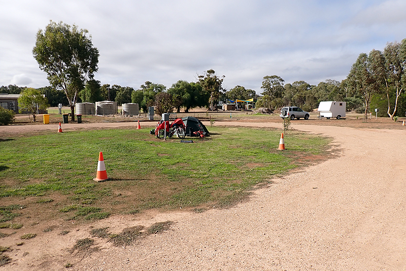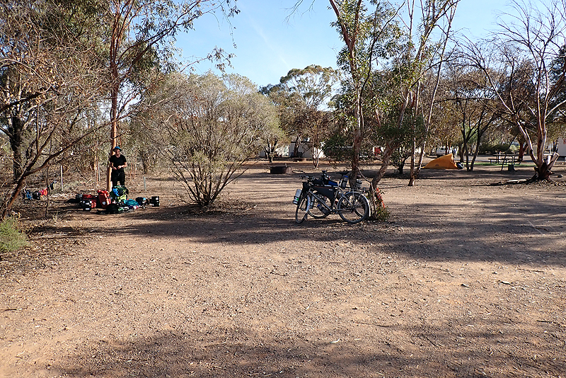 We had planned to go off into the hills again to camp in Wirrabara Forest, but the road we were on had a great shoulder so we stayed on it and decided to camp here in Wirrabara which is a great little place with a lovely campspot at the oval. We had a lovely reception from the onsite caretaker who gave us our own toilet and shower room which was a treat. It is a quiet spot, or it was until the massive flock of Galahs came in to roost nearby - the noise was deafening; like a great swarm of bees! Anyway, they have quietened down. It was great to have a hot shower as we had quite a bit of rain on the bike today, but we've really enjoyed the first relaxing afternoon of the trip due to the shorter day. Our bikes are looking muddy already.