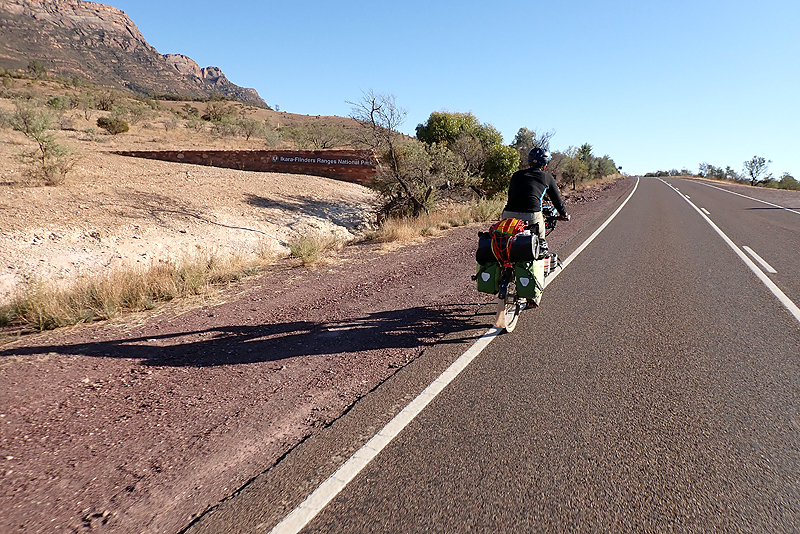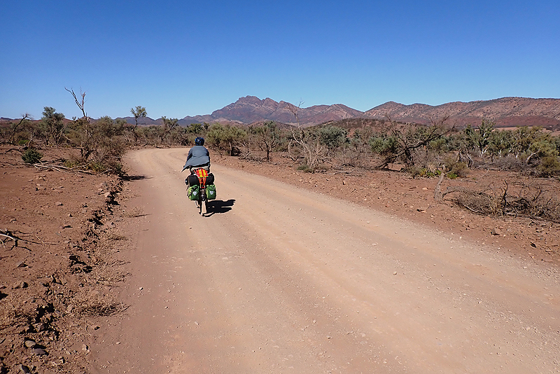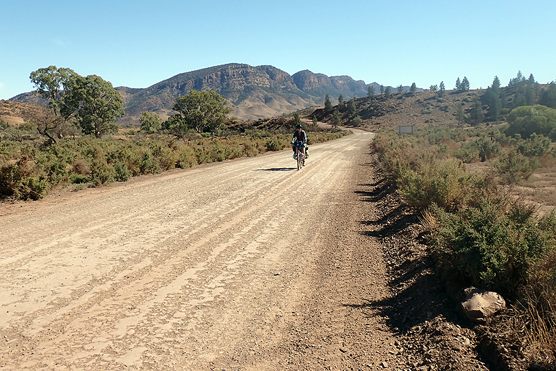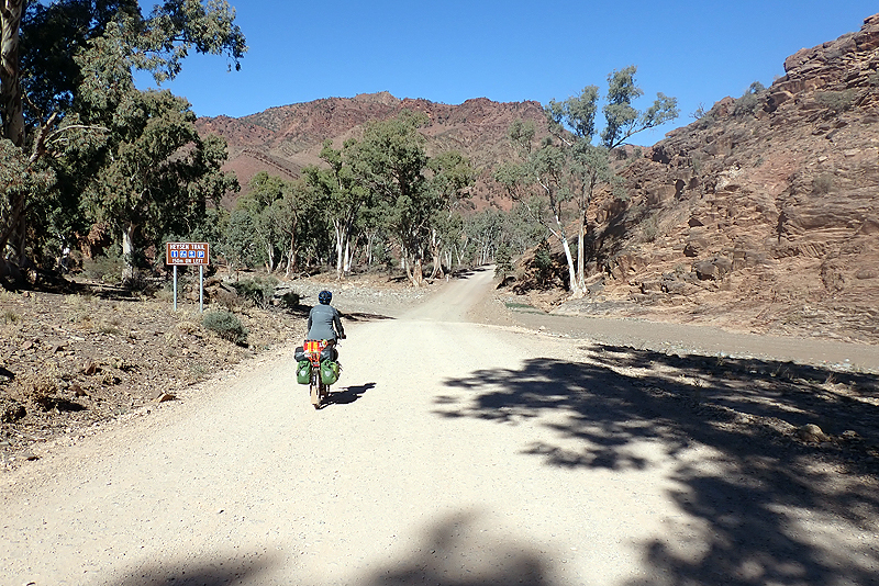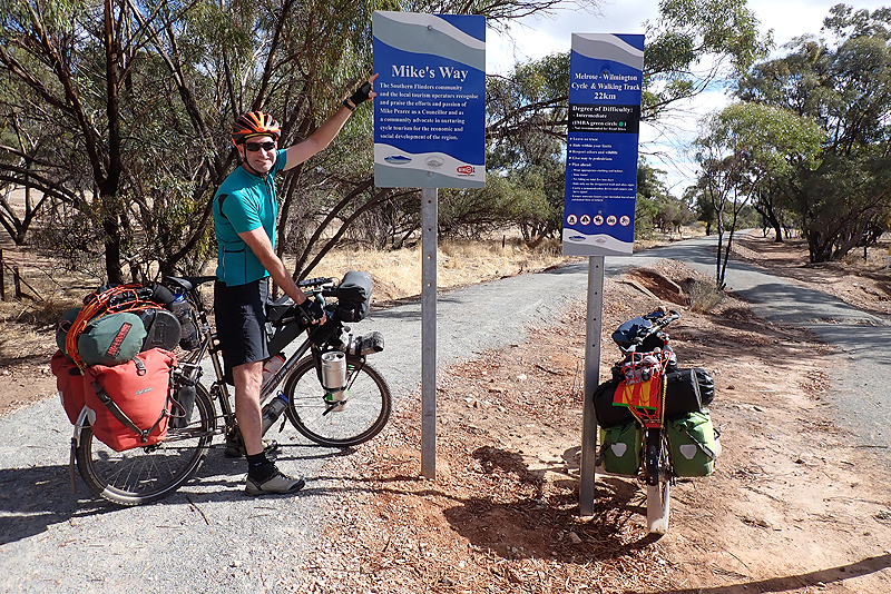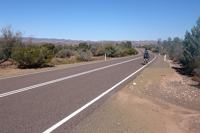 So, the kookaburras slept in this morning. The magpies woke up later. Anyway, still on the road by 7:30. We headed off on the road to Wilmington, still with the good shoulder and the road was very quiet. Just before Melrose we could see there was a bit of a stop-go in the distance as the shoulder-resealing was going on. We had the option of getting onto a cycle route here and we did. A few hundred meters later it turned into an unrideable rock-strewn disaster. So we had to push the bikes a bit through that. Just at the Showgrounds after Melrose we got up close to Mount Remarkable which is a beautiful rock and we stopped for a bit to figure out the route ahead. A friendly motorist pulled over and jumped out of his car and asked if we needed help and pointed us in the right direction to get onto the Melrose-Wilminngton cycleway. We stopped for a coffee break in a dry river bed (every single one is dry) and then got onto "Mike's Path". This is a 20km dedicated cycleway and is pretty darn brilliant. It even counts down in 500 m intervals. It has a great surface and you are able to soak in the views, with the Flinders Ranges now in distant view.