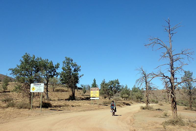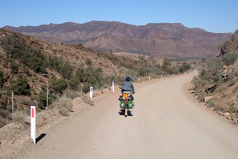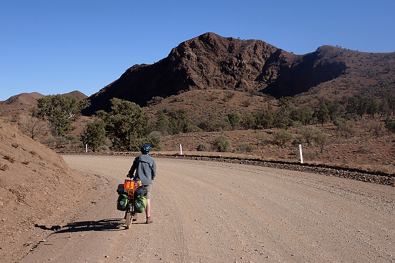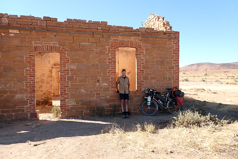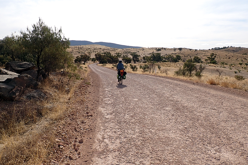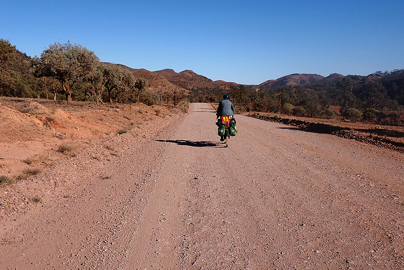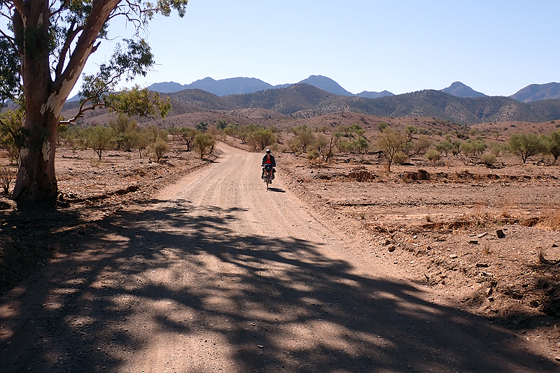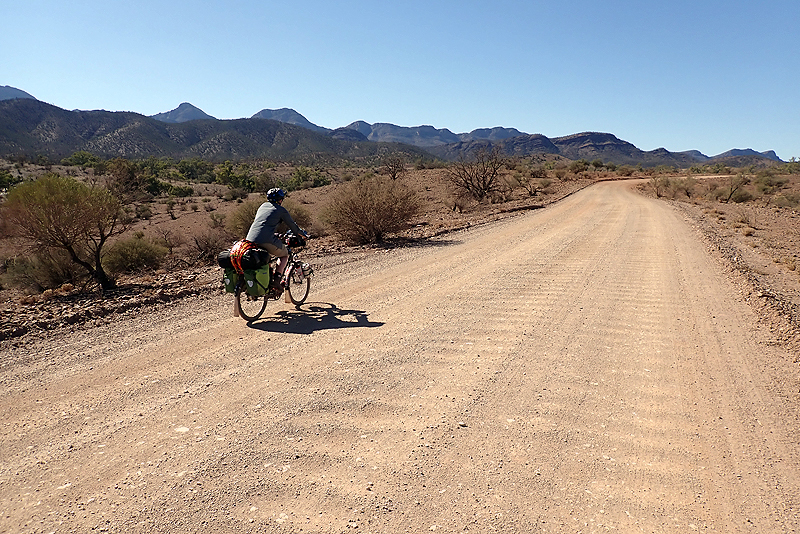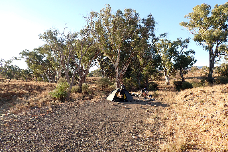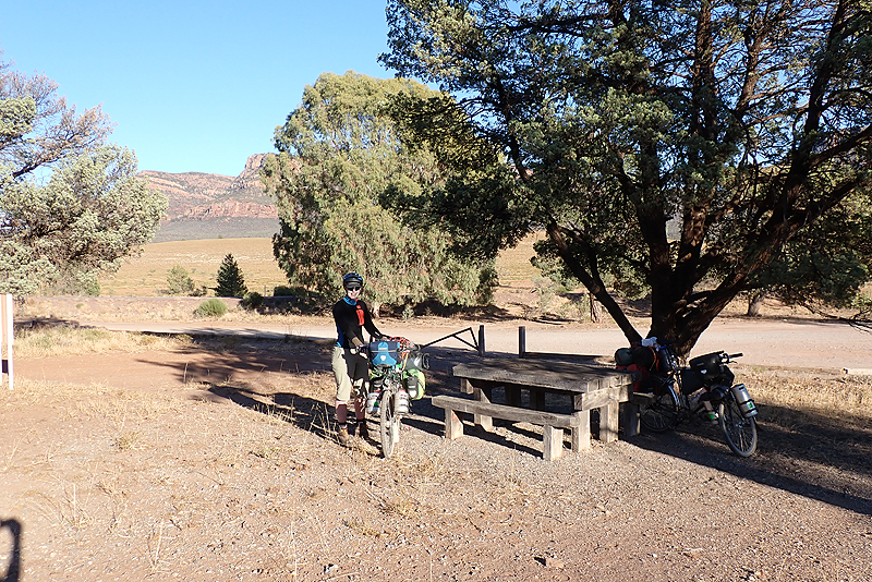 Wilmington's claim to fame is the January night Rodeo and this sport features quite prominently in the village. We picked up some food at the grocery/fuel/hardware store and went to the nearby rest stop area to eat. Mike's Thermarest mattress had a leak (first leaky Thermarest we have had) so we used some water to find it and marked it with a pen to repair later. It grew warm in the sun. We wanted to ride about 20 km from Wilmington into the hills on the Gunyah Road as the Mawson takes this route into Quorn. The road surface was mostly okay and one could pick a narrow smooth section on the bike, and it was well-graded. It was a good ride and we enjoyed the scenery; it was a good day on the bike today. Just at the top of the last climb (we planned to bush camp somewhere on top), Mike felt the load on his bike wobble a bit and when he stopped to have a look he saw that one of the two bolts connecting his rear rack to his bike had just disappeared, as if it had gradually rattled itself loose and popped out. So we had to replace the bolt there and then (he comes prepared with replacements). We turned off on to the Old Gunyah Road, and then rode only a few hundred meters further on to a good campspot by a tree along the road. Only two cars passed us since we picked the spot. We carried a bit more water tonight so we each had 2.5 litres of water for showering, which felt quite luxurious!