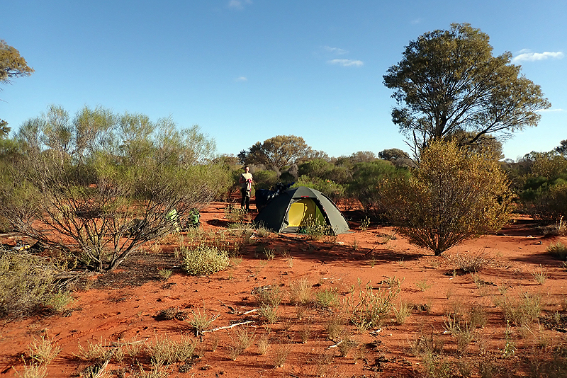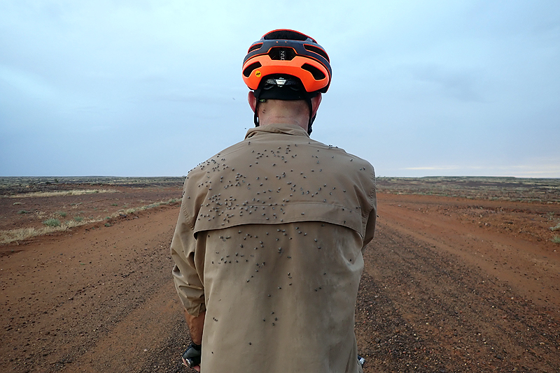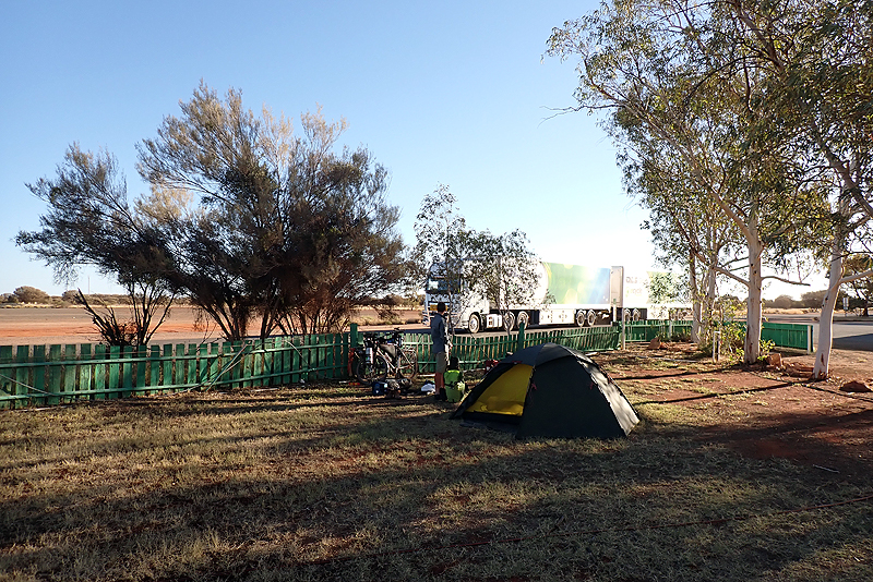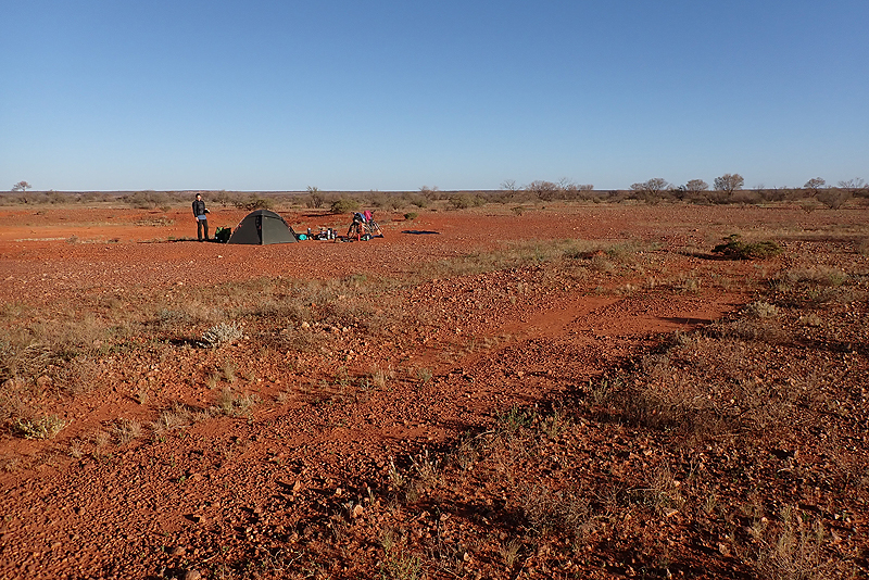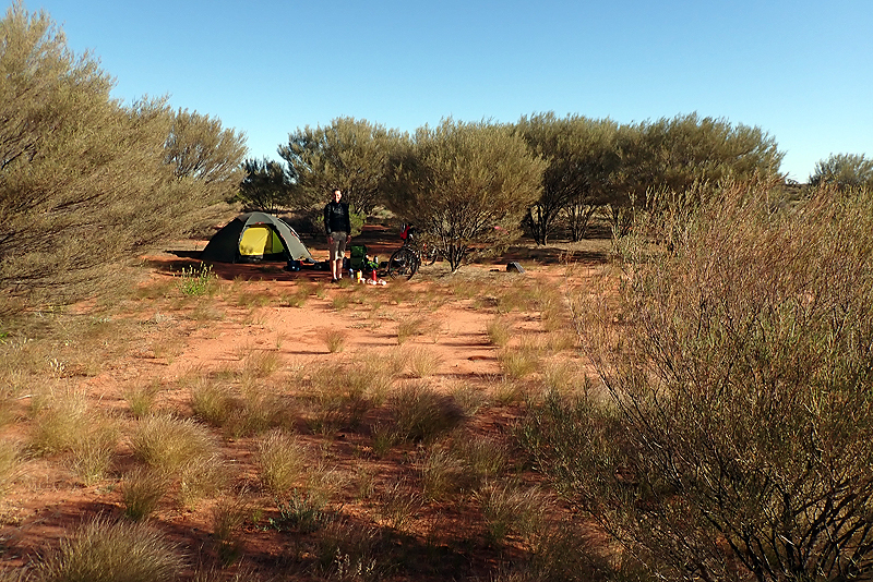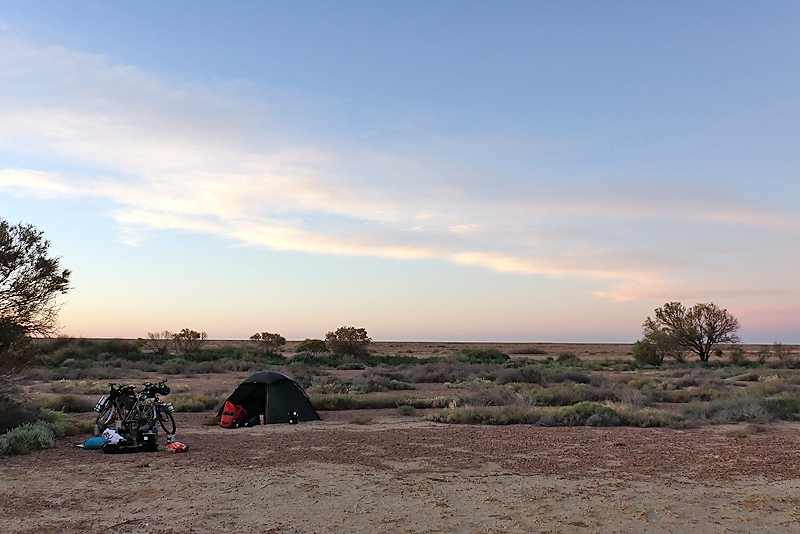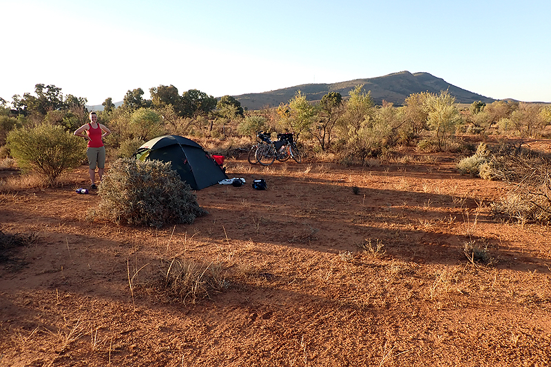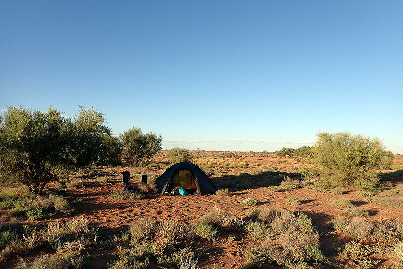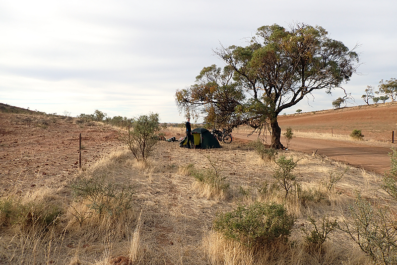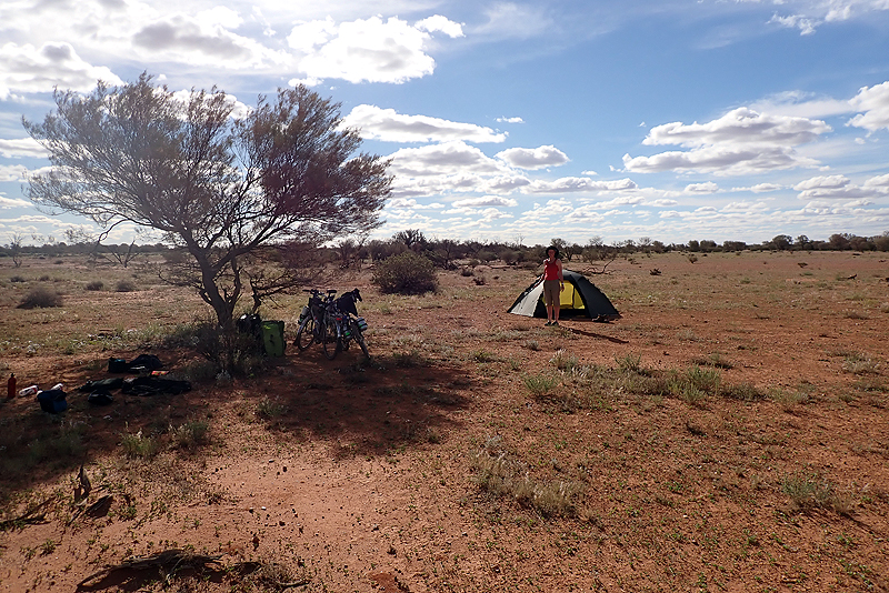 There would be a slight headwind today and it started up sometime after our lunch break at 11:00, as did the flies. This is of course a feature of the outback: plagues of flies. We are using our fly nets and at least they don't bite. They did make for a tasty addition to my jam and cream cheese wrap though. We decided to ride another 20 km after lunch and find a bush camp. The large shrubs out here provide a lot more shade than you would think. We lay under one for a couple of hours before getting into the tent.
