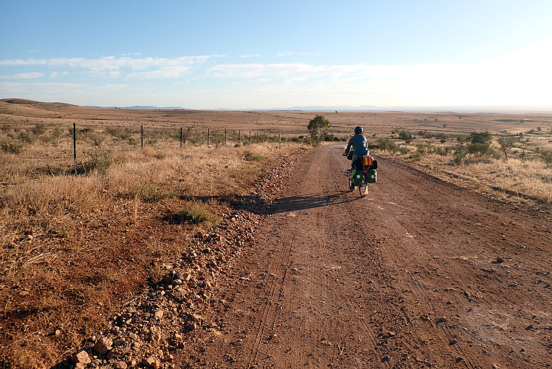 We had decided to go another 80 km today so started looking for a bushcamp around then and found one easily. Just before a helpful guy driving passed slowed down to ask if we needed anything. Earlier another guy slowed down to yell out his window: "You guys are mad!". The road improved at the end of the day, just as I developed a real pain in the arse (not Mike), right under my sit bones. I could no longer sit. I hope it recovers overnight!