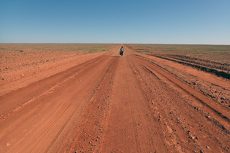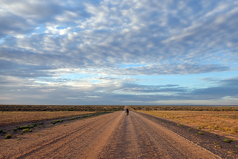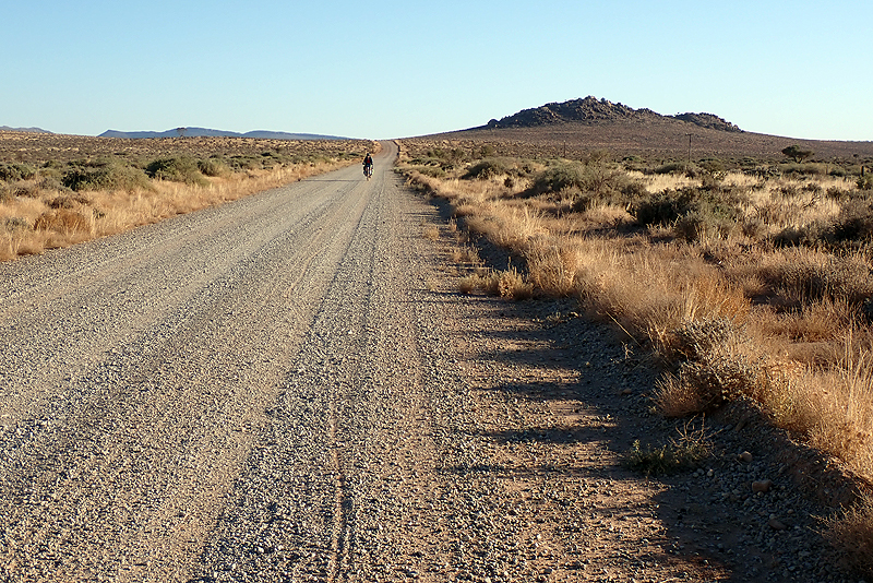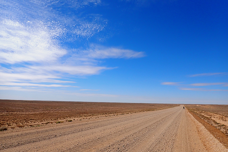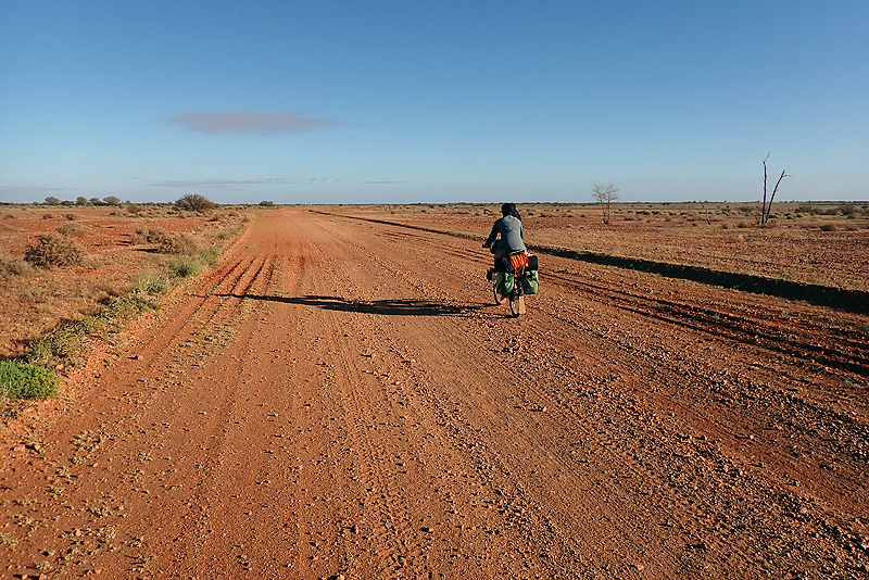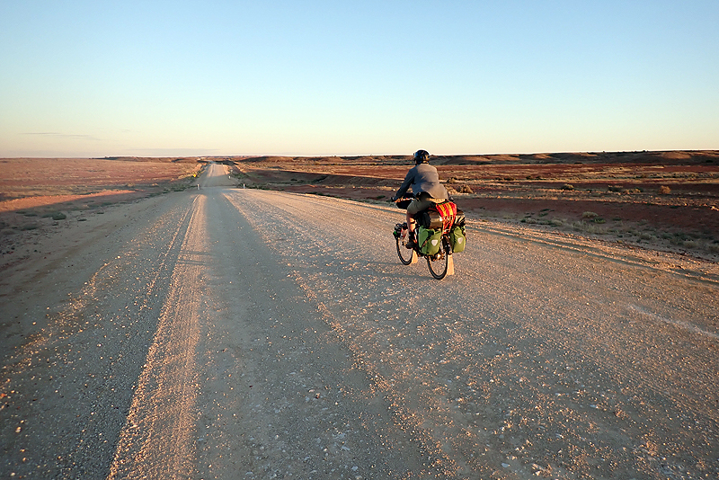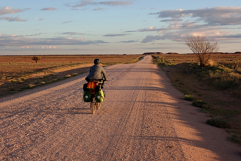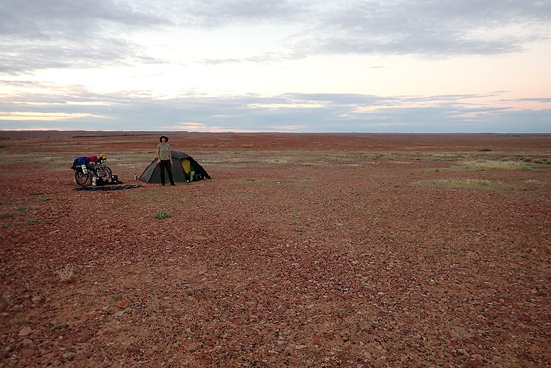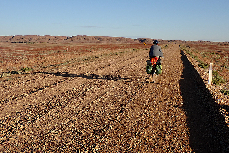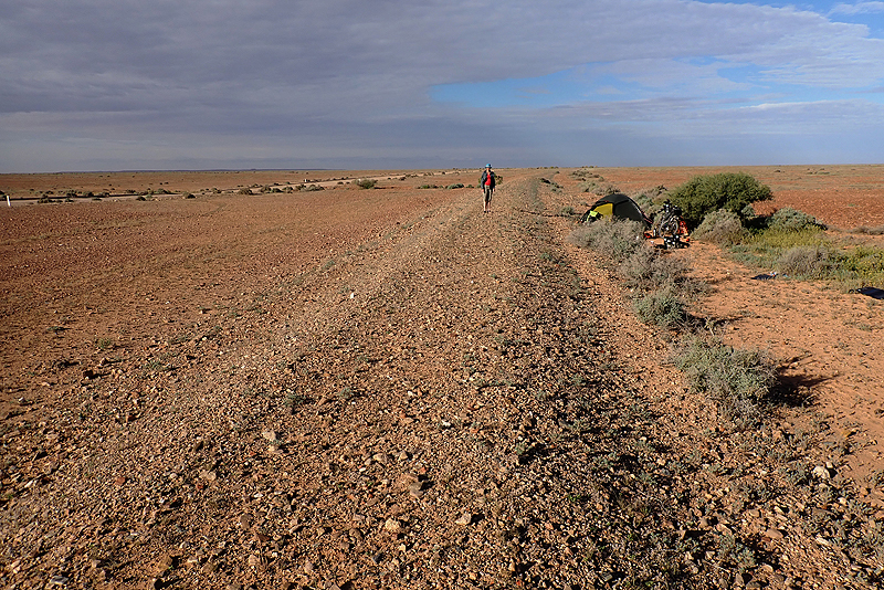 We half carried our unloaded bikes to the track this morning and packed them there. We are so nervous about the thorns. The sun is rising later so that even though we are on the bikes by 07:00 it is only really growing light. This is good as it feels like you are stealing a little daytime for free. We had camped at the 140 km track marker, that is 140 km to Marla, so the plan was to ride 70km today and the same tomorrow. We felt a little tired. The track was okay and then again got steadily worse. We were banking on this changing after the turnoff to Todmorden Station as you would think most traffic to and from happens via Oodnadatta. This was a correct assumption but after this point the road grew interesting. The best part was no corrugations. The cause - no one comes here. We saw a total of 7 vehicles all day and once again only one coming from Marla. You can kind of see why, there is nothing out here for people to see. It is only a couple of cattle stations and so if you see a cow or two you are lucky. The scenery is still beautiful, but our guess is most people drive Maree-William Creek/Oodnadatta and then turn off to drive through the Painted Desert, Coober Pedy, etc. So given that the track is not often used, it was often very rocky or at least rock strewn. This is okay for a part day on a bicycle, but trying to churn out 70 km on this stuff day after day becomes a punishment. The only way through is just to think around 08:00, "Okay, today I get to throw my body and bike at this until it is over." We would have loved to ride an extra 10 km but it was not possible. As the trip distance clicked to 70km we were at a lovely gravelly flat section by the roadside and called it a day. It was alreadt 3:00 pm!
