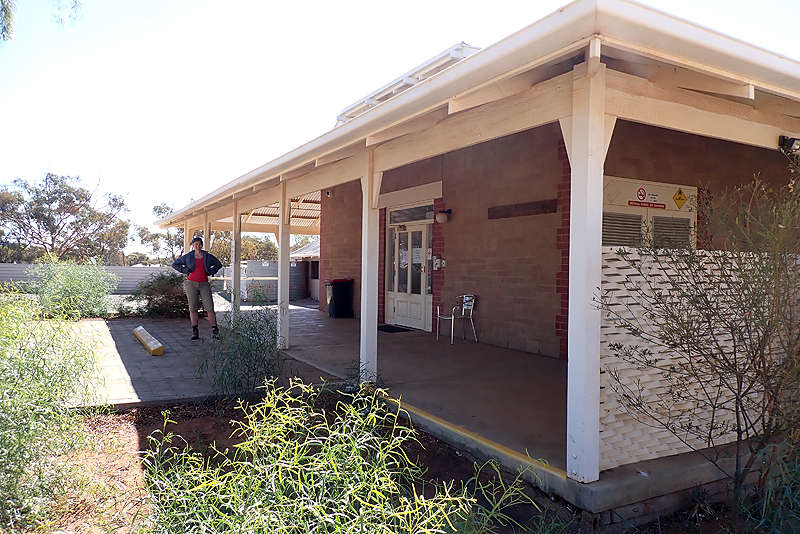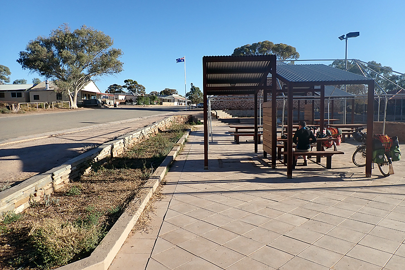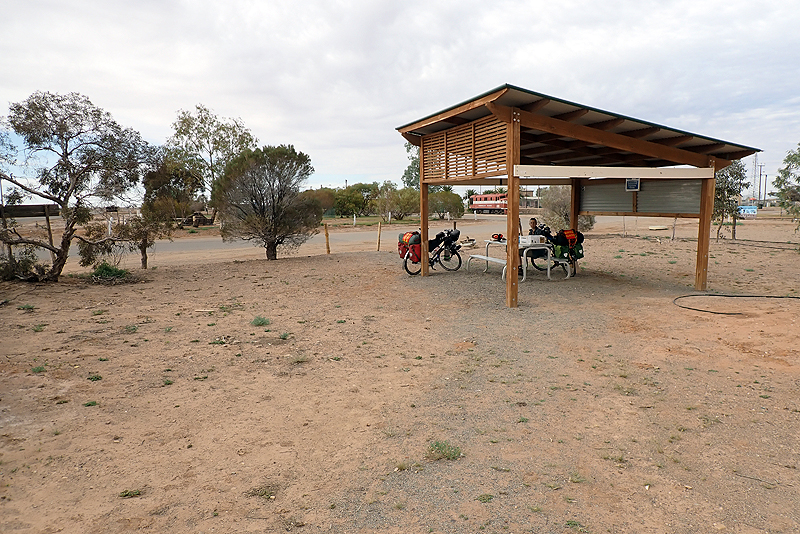 We are trying for an earlier start and woke up at 05:30 this morning to be on the road before 07:00. It was so weird last night in bed; you could see the truck lights coming for about 10 min before they passed us - Super bright lights, but no sound, just super eery. We saw a few road trains on this road, and they were very loud when they passed our campsite, and also gave us food for thought as we try and avoid them. It grew windy overnight too and stayed warm. We slept with the outer tent doors open and could see the stars and milky way which were absolutely brilliant (bright) before the moon rose. We only had 55km to Leigh Creek but with the headwind it seemed to take forever. We pulled over at the turn off to Beltana historic village and leaned the bikes up against a metal cupboard. In a while a delivery truck came along to deliver things that had to go into the box, so we moved the bikes. The delivery driver was a jovial fellow who gave us the daily paper to read free of charge!