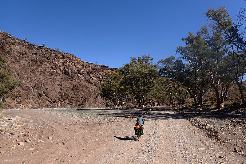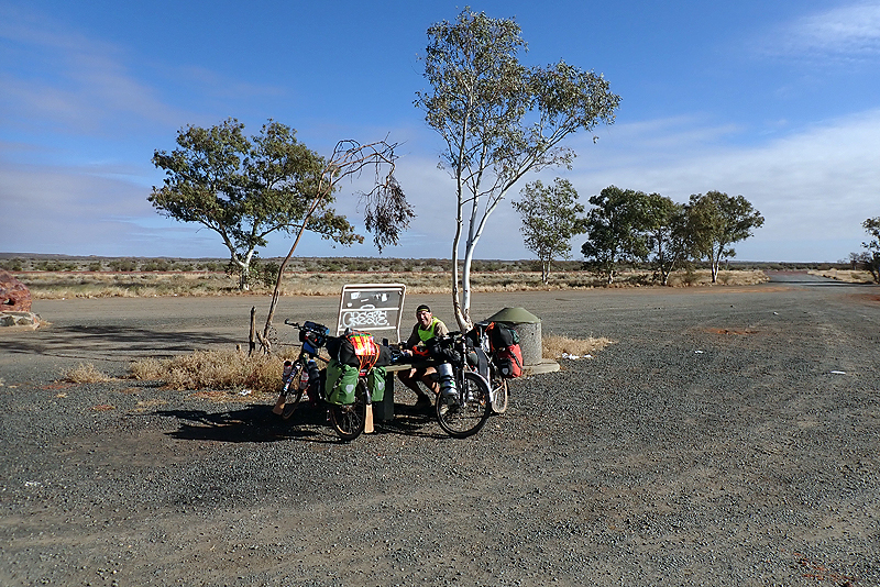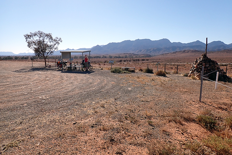 We had a slight tailwind today and it is just amazing what some good bitumen combined with the wind can help you achieve. We only had morning tea after 54 km and the butter and jam sandwiches kept us fueled for the rest of the day. It was a great ride. The road has a shoulder, very narrow for the most part and rumble strips separate it from the road, but they are not difficult to ride if you end up on them. The traffic was mainly quite quiet and mostly caravanners and the odd road train. We stopped a couple of times after morning tea at designated picnic areas. We were able to get more water at a tank at Marryat Creek Picnic Area and camped a couple of kilometres after this.