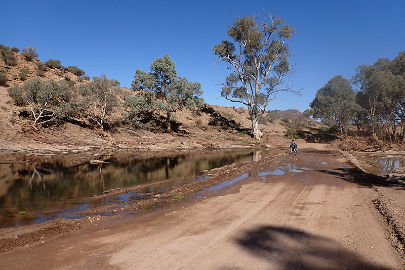 The pavement ended here and the road conditions varied. Suddenly we found ourselves in the Outback. It was like flicking a switch, no more pastures, and paddocks empty of crops, suddenly it is just small thorny shrubs and red dirt. We were totally amazed to come across a river and thought this would be a great camp spot. We took a track off the main route to have a closer look, there were great pools of water, obviously from the recent rains. We turned back to inspect it further on but the white crust on the surrounding rocks gave the clue before we tasted it, salty. You can imagine lost explorers being driven mad by such an experience