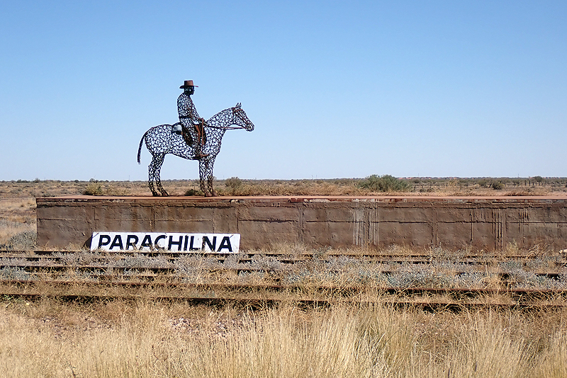 We pulled over on the side of the road to upload the website but the internet signal disappeared. As said aerial was in Parachilna we thought we would have lunch there and give it another go. However, said aerial was obviously not THE aerial as there was no 3G signal available. Parachilna would not be much to write home about on a good day, but with the public toilets closed and the hotel closed for renovations, there was only the old Ghan Railway station and a couple of picnic tables and benches. Still, they are trying to make something of the place with metal artwork. We headed back onto the bitumen and stopped at a creek about 10 km further on to camp. We could have kept going today but we are going to camp at Leigh Creek tomorrow and do laundry and are now about 55 km from there which is a morning's ride on this road which should be quiet and cool at that time. Only problem with our chosen bush camp was the fly plague.