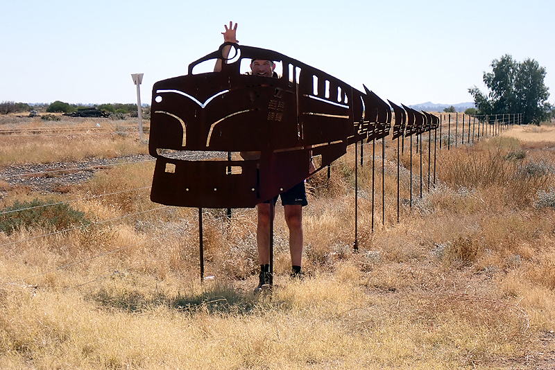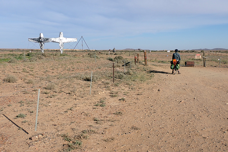The road was in much better form today, although you stilll need to concentrate hard, you can at least look at the view and overall our average speed was pretty good for an unsealed road. We saw the strange sculptue park (see pic).We stopped for our morning coffee at the turn off to a mining road. A mining vehicle came along and the driver and passenger were friendly and had a chat. They were inspecting a water pipe feeding the Olympic Dam Mine in Roxby Downs which they said was 2 hours that way. They wished us well on our trip. A short while later we came down a hill towards two caravans camped by a creek and a man who had been walking along the fenceline came running along to chat to us. He and his wife have travelled from NSW and are on the road for 18 months. He offered us water and was interested on our trip. When we stopped for lunch a while later he came along again this time with wife and van, hopping out of his car to find a Geocache on an old rail bridge and we had a chat again. All the other vehicles passing us were really good, everyone waving, hooting and even shouting encouragement out the window, always giving us plenty of room. It is a great atmosphere.