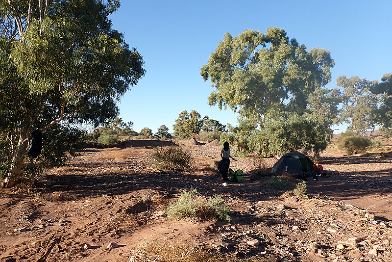 The track to Wilcolo Campground and beyond started just at Wilpena Pound Campsite and it was about an 8 km ride. Until we realised pretty quickly that for us it would be mostly unrideable. It was pretty technical in places, almost all single track with deep ruts and crossed any tiny pitched creek beds which were massively steep both down and up. Some sections had sharp shale embedded so that they stuck out for you to ride over. This kind of stuff can really take your tyres apart. I guess for mountain bikers that like to have a story to tell "How I blew two tyres in one day" it is part of the excitement, buy our tyres have a long way to carry us! We got to a part where we could not actually work out how to traverse this steep creek bed crossing and almost turned back. Eventuallly we got there, the route improved towards the end (which is a good thing as we have to get back onto it tomorrow). The campground is in a beautiful spot with great views of the mountainside and surrounded by fir trees. It is convenient to have a toilet and the water tank. They could perhaps have stretched the budget to a picnic table and benches. We spent the afternoon doing a bit of resting and recuperation and also some maintenance. Tomorrow we will call it a day on the Mawson Trail