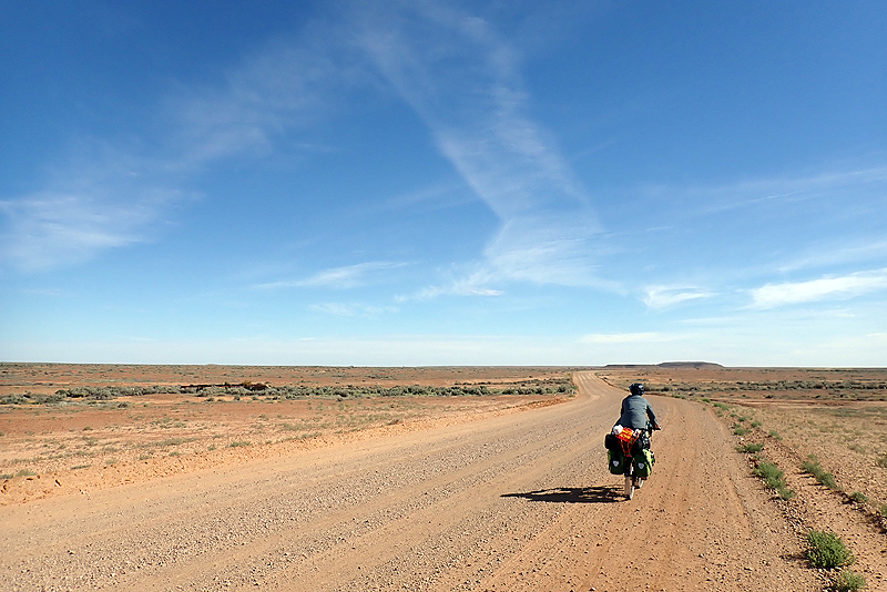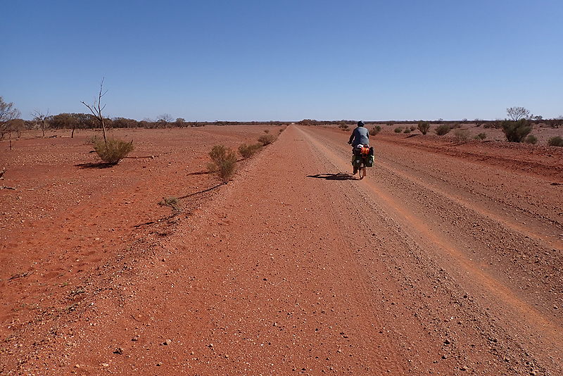 We saw a lot of cows today, well bulls actually, except there was one group of cows with babies. The track passes through Todmorden Station, another big cattle station. As always, the station is unfenced so the animals wander onto the track. Then they see us and go a little crazy, running all over the place. I guess as the track is quieter further north they make more use of it in their wanderings. We still had many flies, as it was a headwind day our backs are completely covered with them taking shelter. Also, they crap all over us; the backs of our shirts have hundreds of little dots on them, it is fly poo. Eventually the road was more "bad" than anything else. Very sandy in patches with fine red dust. We had to get off and walk in bits. The only good thing in all of this was besides the vehicles I have mentioned, we saw not one other. Apart from the cowboys this morning, no other vehicles came from the opposite direction. At the lowest point of the afternoon it took us an hour to cover 7 km. Then the road improved a bit and became rideable, but we were fighting a headwind and also carrying all the water so it seemed a good idea at 70 km to call it a day.