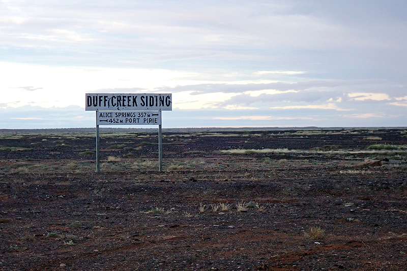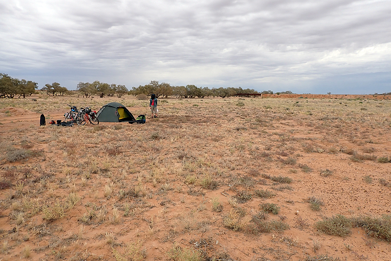 We knew that rain was forecast for tomorrow and it grew a little overcast. Rain is a hit and miss affair up here. If you are cycling the Oodnadatta you hope for the miss! Suddenly the Ghan was back in view and after not seeing any eucalypt trees since lunchtime we came to Duff Creek where the trees threw good shade. It is a big effort to get the bikes off the road into these creek beds as the dried mud and sand is soft and the weight of the bikes just siinks them straight in. We lay in the shade for a while, then decided to move everything over the road and along a track out of the creek bed as with the possibility of rain, these creeks can fill in a few hours. This meant hauling our gear to our casmp site first and then pulling the bikes out of the creeks and along the road. It is a great little camp spot though. As there were no trees there though, it meant showering in full view of the road. The road is dead quiet but of course a 4WD drove past when I was rinsing off. We stand on an old tent ground sheet to shower so I could just grab the end off the ground and use it as a modesty screen. Mike threw a towel over my head for good measure. As the sun was setting a 4WD pulled in to camp under the old rail bridge. Who would have thought... with the whole of Outback at their disposal? Drops of rain are falling on the tent.