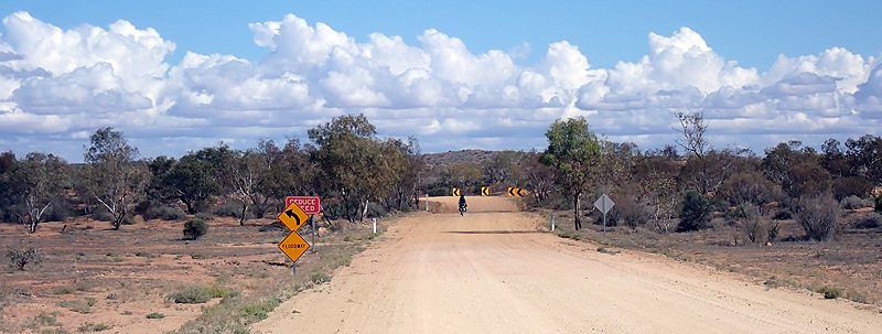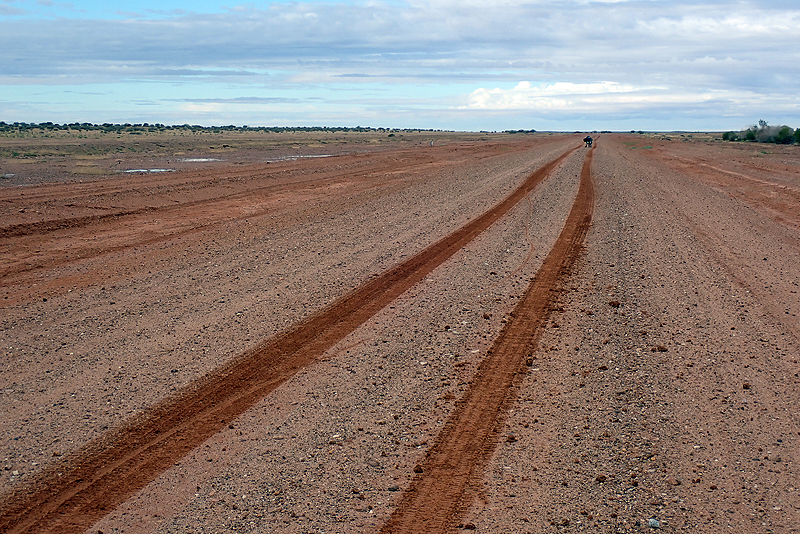 It rained a bit overnight, big drops that did not really wet the ground, but as we got up the rain increased. We made breakfast and ate in the tent. We set off quite early (before 07:00) into a gloomy morning. The road was pretty good for about the first 10 km, then at the turn off to Nilpinna Station it got really bad for about 8 km. The rain cleared up and we saw a road roller parked by the road with very fresh tracks leading to it. Winner! We sat on it and had our tea/coffee. About a 100m down the road we hit a freshly graded road! Fantastic! Pace picked up a lot and we sped off. After a few kilometres though the freshly graded road became a problem. The rain had fallen heavily in this area and lay in pools by the road side (can you believe it, pools of water on the Oodnadatta? Neither could we). We were following fresh tyre tracks left by a caravan that morning and the mud just completely jammed up my tyres as it built up between mudguard and tyre. Mike found a handy stick to pull the mud out but it kept happening. Eventually I could barely ride at all. We managed to get to a creek with some trees and I unpacked my bike so that Mike could adjust my rear mudguard for extra clearance. After this the road was much drier anyway as it seemed the rain was very localised.