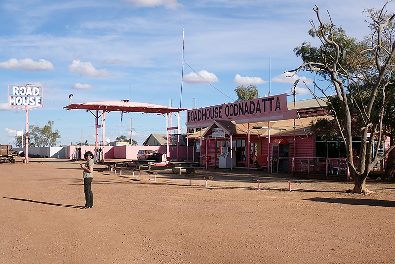 The road was mostly good on the short ride to Oodnadatta. There were a few sections which were very badly corrugated and the edges far too deep in gravel to ride, but overall good. Quite a few cars leaving Oodnadatta in a hurry. We found out later that yesterday was gymkhana which explains it. We saw our first dingo today on a hill alongside the track. He was being harrassed by a few crows. The Old Ghan Railway drew in very close to the track as it neared it's northern terminus in Oodnadatta. A few kilometres before the town you can turn off towards Coober Pedy. We pulled into the famous Pink Roadhouse at 11:30 and ordered two Oodna burgers with the lot. This was an amazing meal, just the right size for cycle tourists! Very friendly people at the Roadhouse too. They have a good grocery store. We are staying at the campground behind the roadhouse. We washed our cycling clothes and enjoyd the shower. We relaxed in the shade of a tree and went for a stroll around the little town. It has a nice feel to it. There is even a free camping ground in town at a picnic site, but no toilet there. The town does not have treated water but the roadhouse told us about the school which has a solar water distillor trwith a little tap. We filled up for the next three days to Marla.